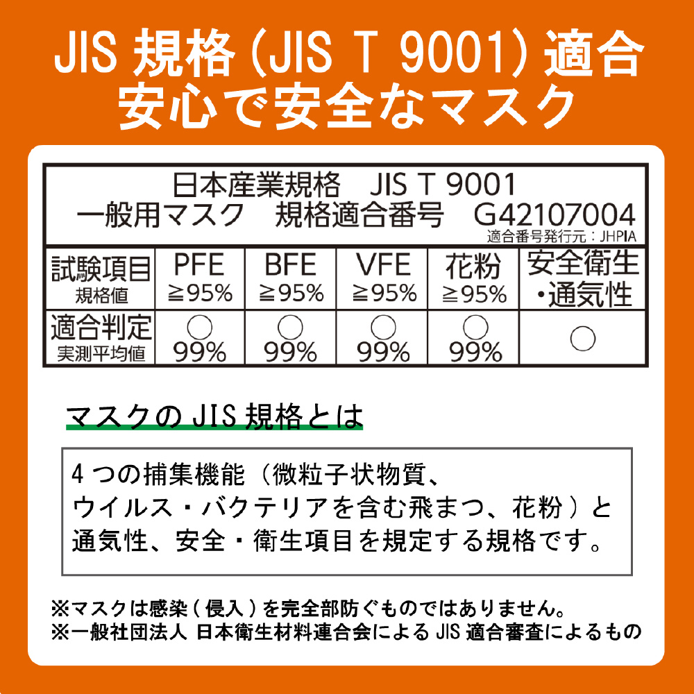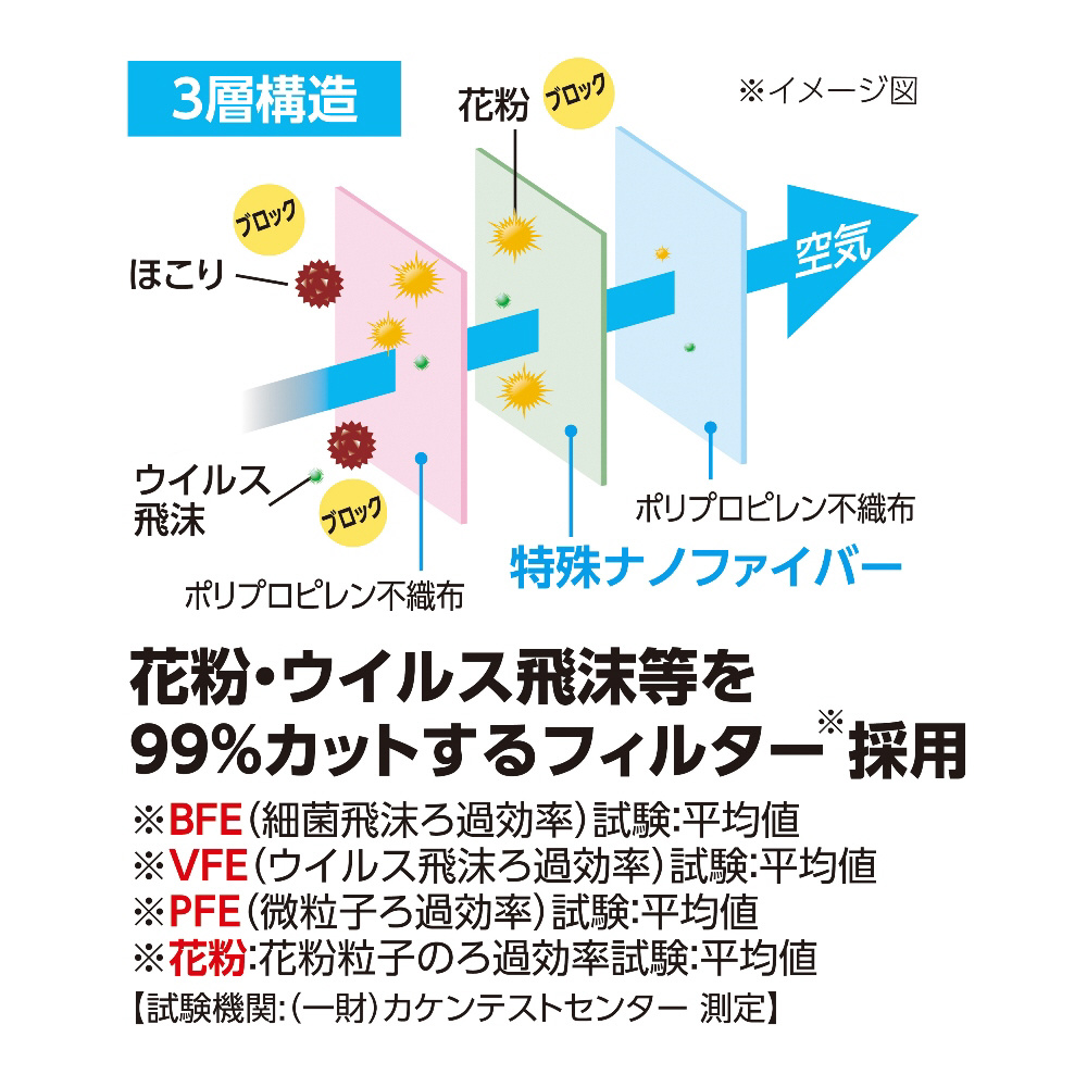 ■花粉・ウイルス飛沫などを99%カットする特殊ナノファイバー加工の中間層を採用した3層構造により、通気性を保ちながら飛沫の侵入を防ぎます。