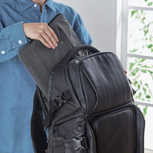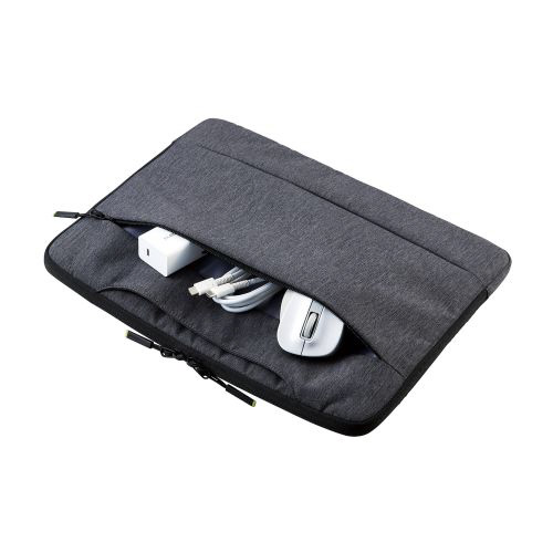 ■ACアダプタ・マウス・ペンなどの周辺機器をまとめて収納できるフロントポケットがついています。ポケット内部には、収納物の整理に便利なスリーブポケットを備えています。