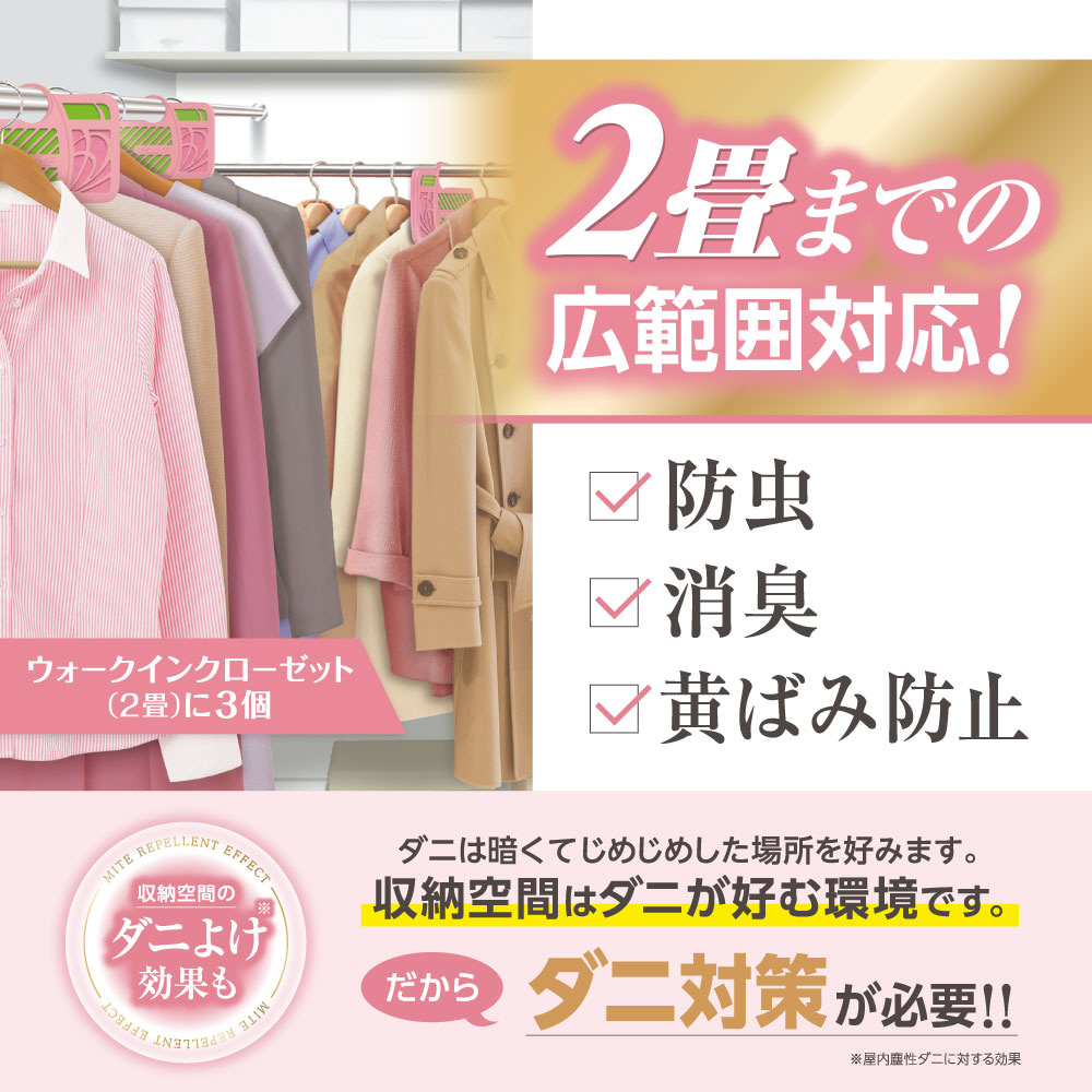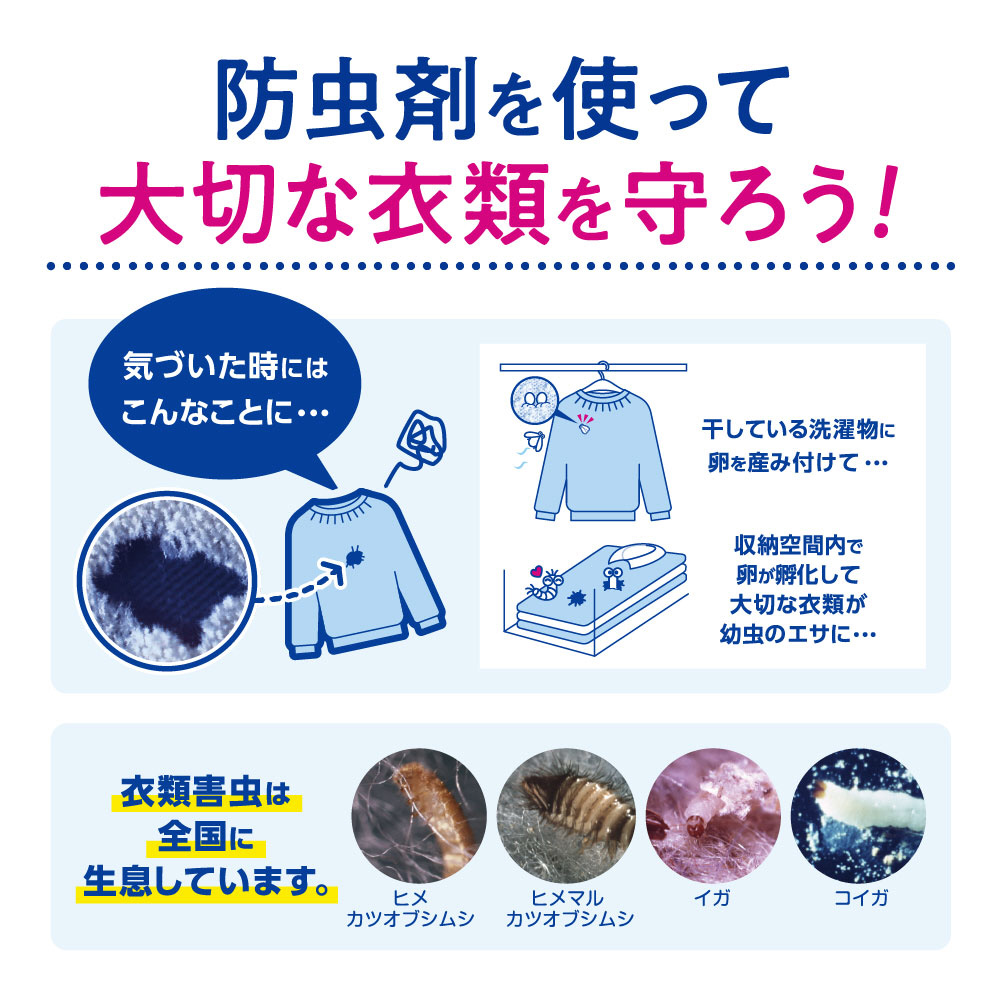 ●せんいの防虫に加え、気になるダニを収納空間内に寄せつけにくくします。(ピレスロイドの効果)※収納空間内に屋内塵性ダニを寄せつけにくくする効果を確認しています。※マダニやイエダニを対象とした製品ではありません。