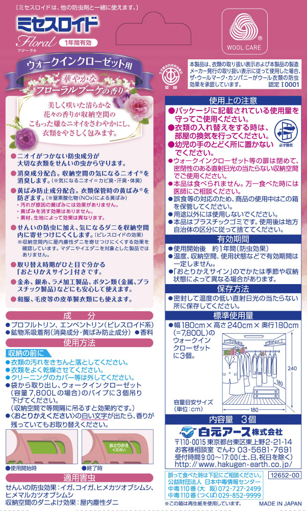 | 商品名 | ミセスロイドフローラル ウォークインクローゼット用 3個入 1年防虫 フローラルブーケの香り |