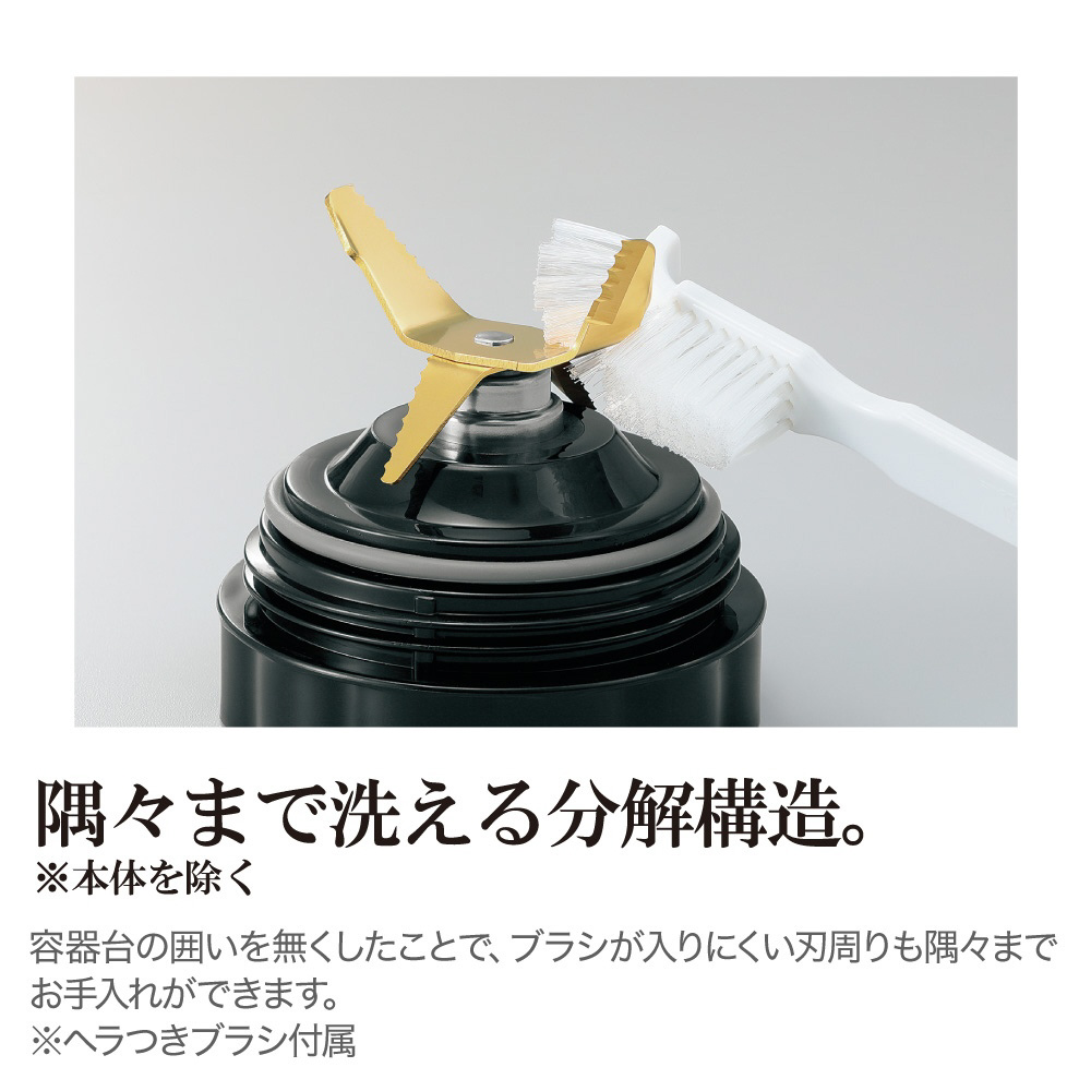 ミキサー容器とブレード部は回すだけで簡単に取りはずし可能。また、ブレード周りの囲いをなくしたことで、ブラシが入りにくい 刃回りも隅々までお手入れができます。