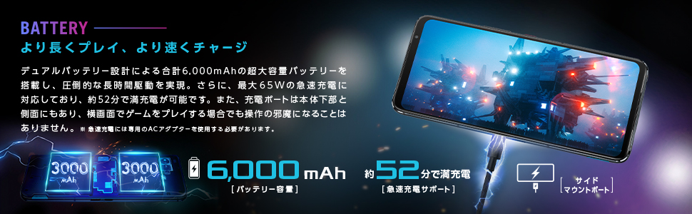 デュアルバッテリー設計による合計6000mAhの超大容量バッテリーを搭載し、圧倒的な長時間駆動を実現。