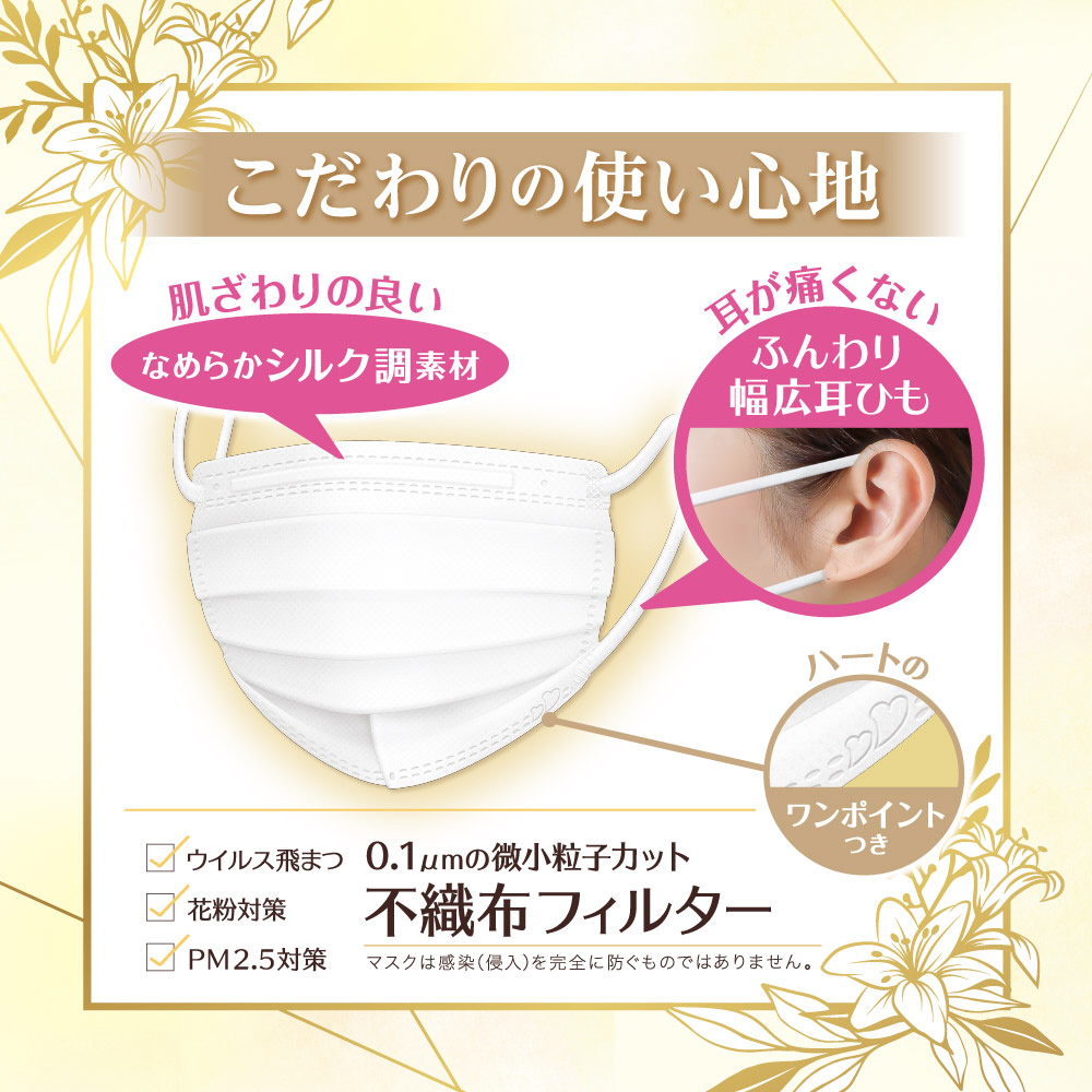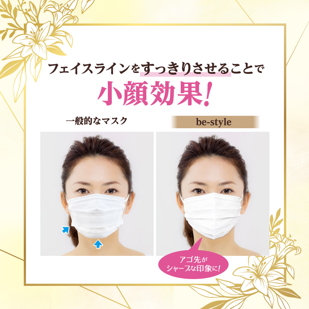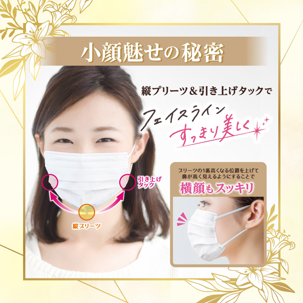 小顔に魅せる女性用のマスク。上から広がるプリーツですっきりとした横顔に。