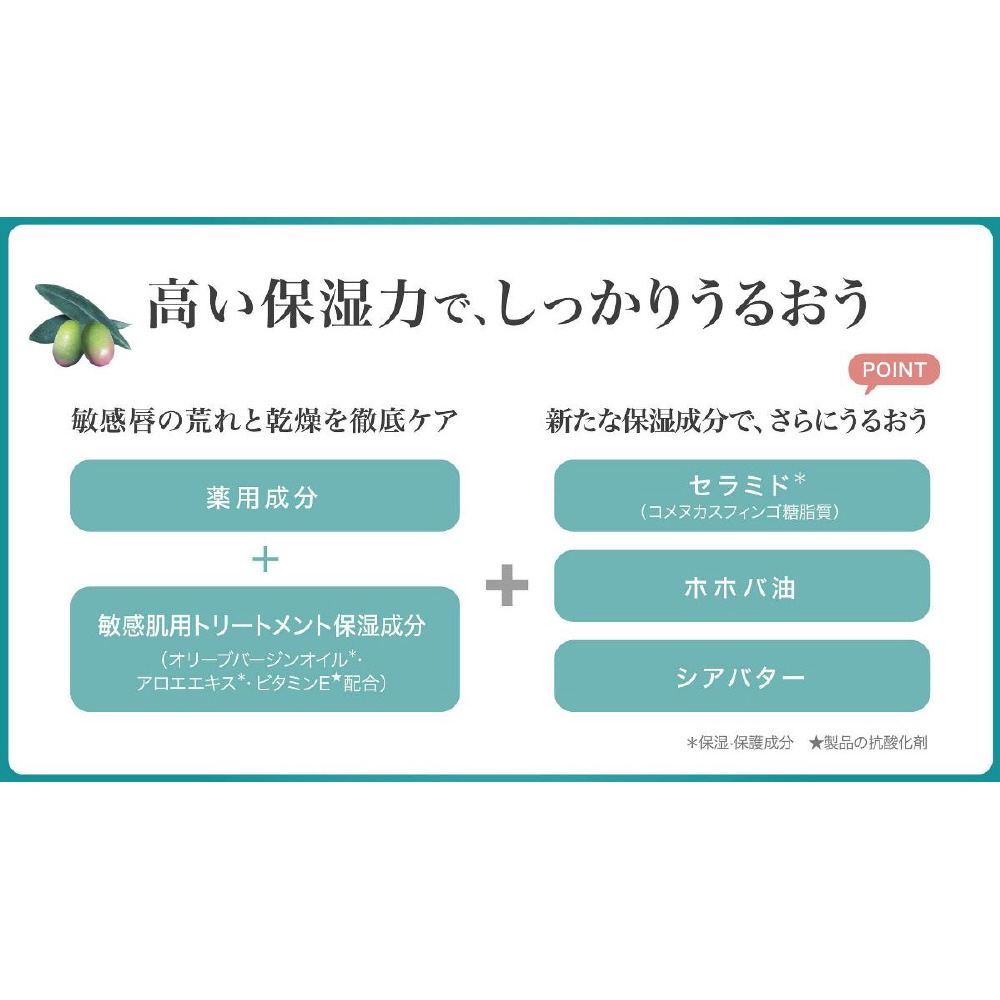 「DHC薬用リップクリームセンシティブ」には、薬用成分に加え、バリア機能をサポートするセラミド、うるおいを守る働きに優れたオリーブバージンオイルやアロエエキスといった植物由来成分を配合しました。ひと塗りで唇にすっとなじんで、ベタつかず、保湿や保護を叶え、なめらかな塗り心地でしっかりフィットし、見えないヴェールとなって、うるおいとツヤを持続させます。
