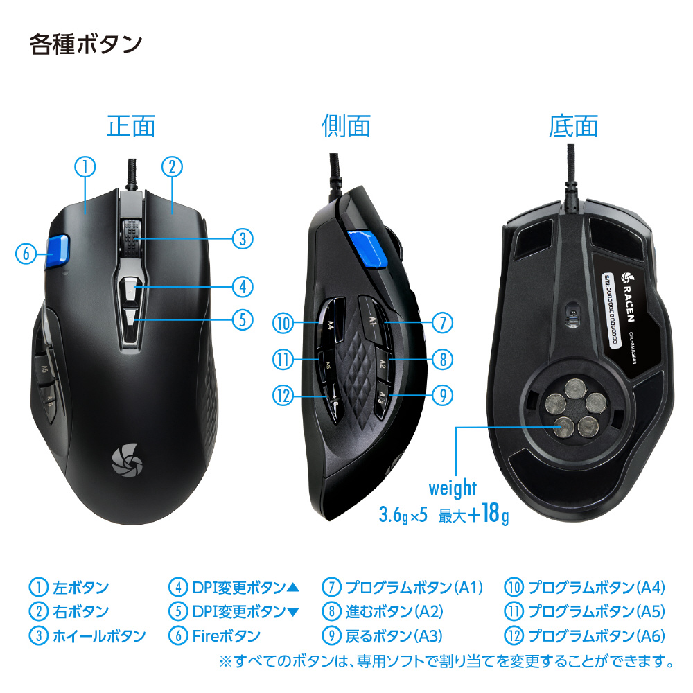 RACENゲーミングマウスシリーズ第3弾!5つのバランスウェイトで重量調整可能なマルチボタンマウス!