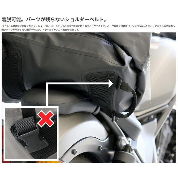 バッグ背面に接続用パーツが残らないため、リアカウルの塗装面へ固いパーツが干渉する心配が一切ない、ドッペルギャンガー独自の仕様です。