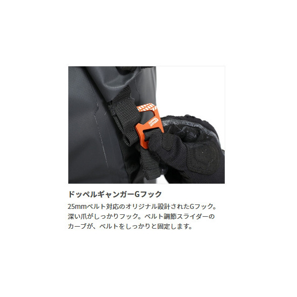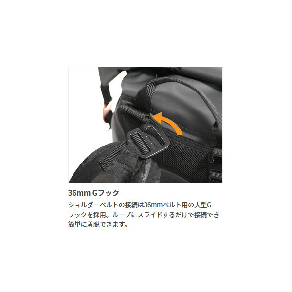 バイクへの積載時に邪魔になるショルダーベルトは、Gフックの操作で簡単に取り外すことができます。