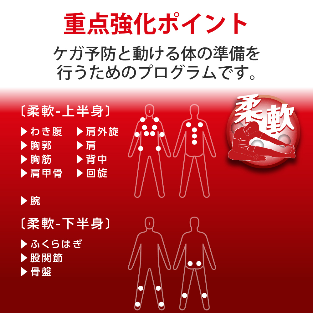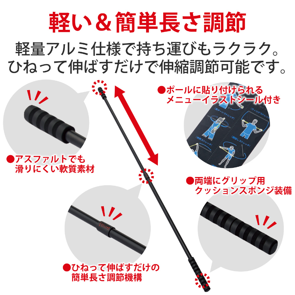 ■ケガ予防と動ける体の準備を行うプログラムと長さ調節可能なウォーミングアップポールです。