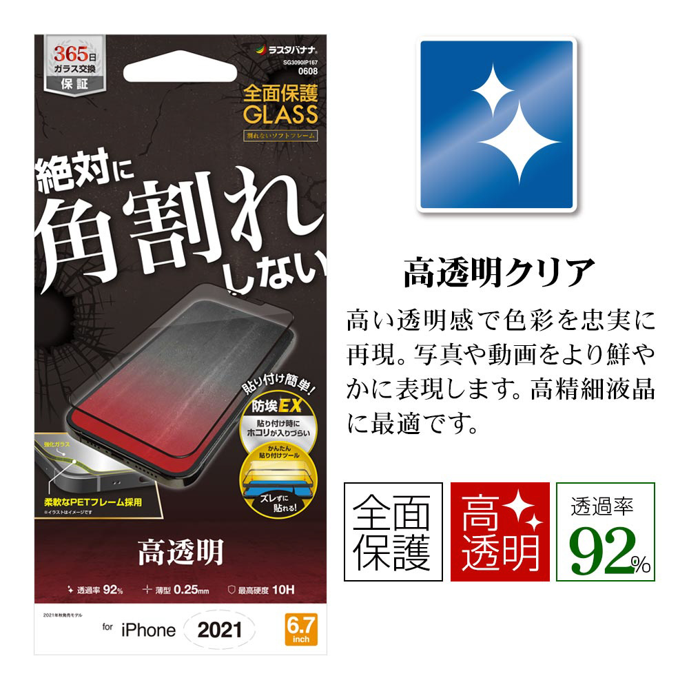 本製品は絶対に角割れしない全面保護ガラスです。立体形成のPETフレームを採用しています。