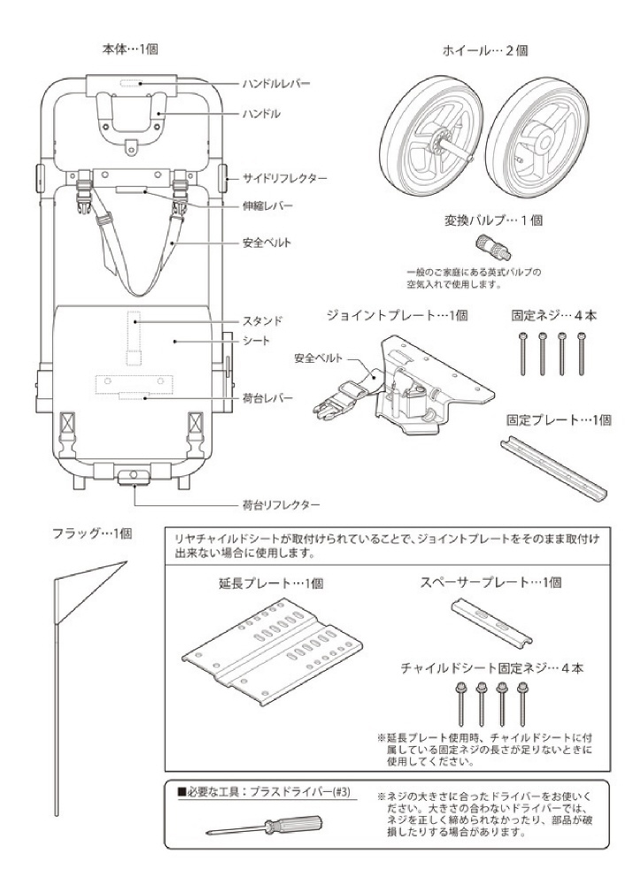 ●走行時はフラッグの取付けをお願いいたします。必ず付属のフラッグを立てて走行をしてください。自動車のドライバーからサイクルトレーラーが見えない危険性があります。フラッグを立たせて存在をアピールするようにしてください。