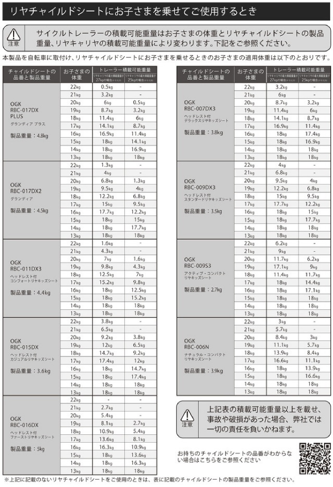 ●積載量にご注意ください。キャリヤの最大積載量(クラス)とリヤチャイルドシートに乗せるお子さまの体重により、サイクルトレーラーに載せられる耐荷重が変化します。