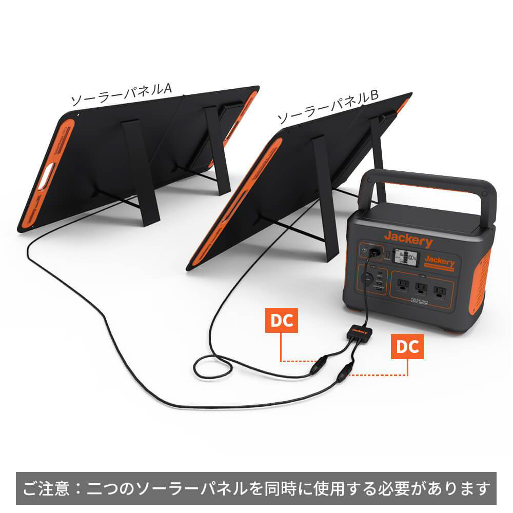ソーラーパネル Jackery SolarSagaシリーズのDC端子出力からアンダーソン端子入力のポータブル電源に電力を供給することができます。 Jackery SolarSaga 100を2台並列接続して、Jackery ポータブル電源 1000を充電することができます。約8時間で満充電が可能です。