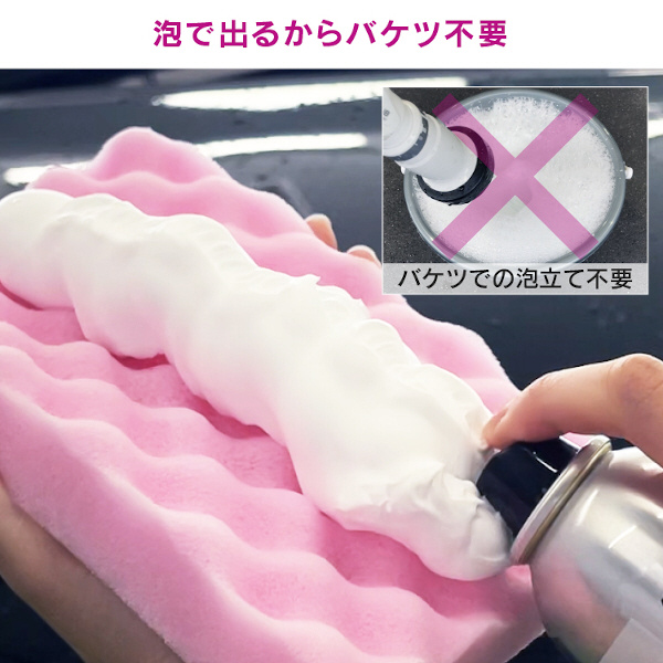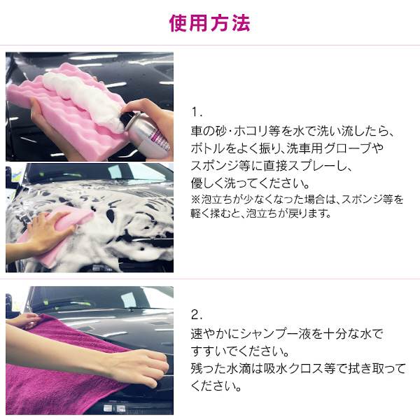 ボトルをよく振り、洗車用グローブやスポンジ等に直接スプレーし、優しく洗ってください。