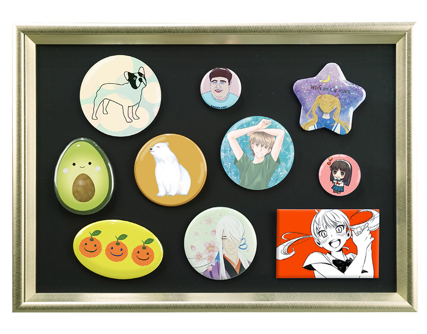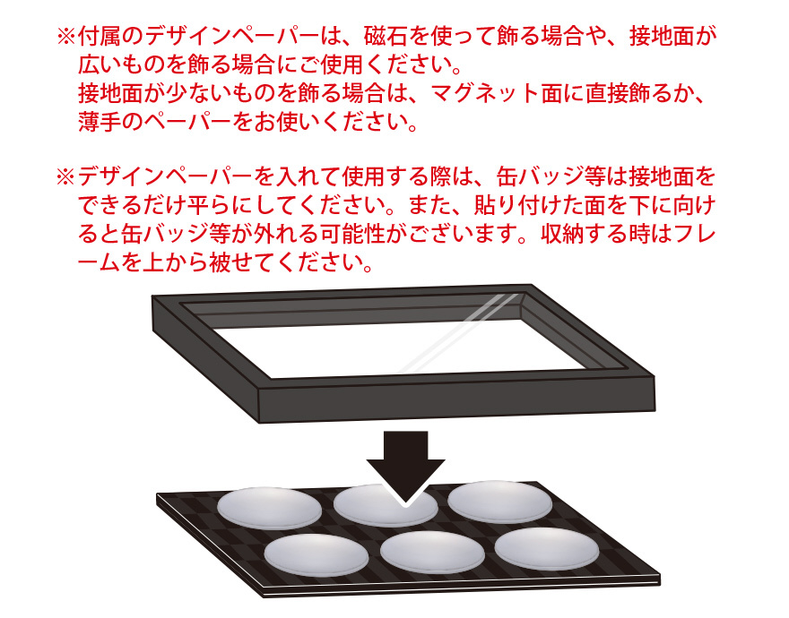 マグネットなので、缶バッジを直接取り付けたり、マグネットで写真を留めて飾ったりすることができます。付属の2種類のデザインペーパーは、飾る際の背景としてお使いいただけます。2L判、A4判の2サイズ展開です。