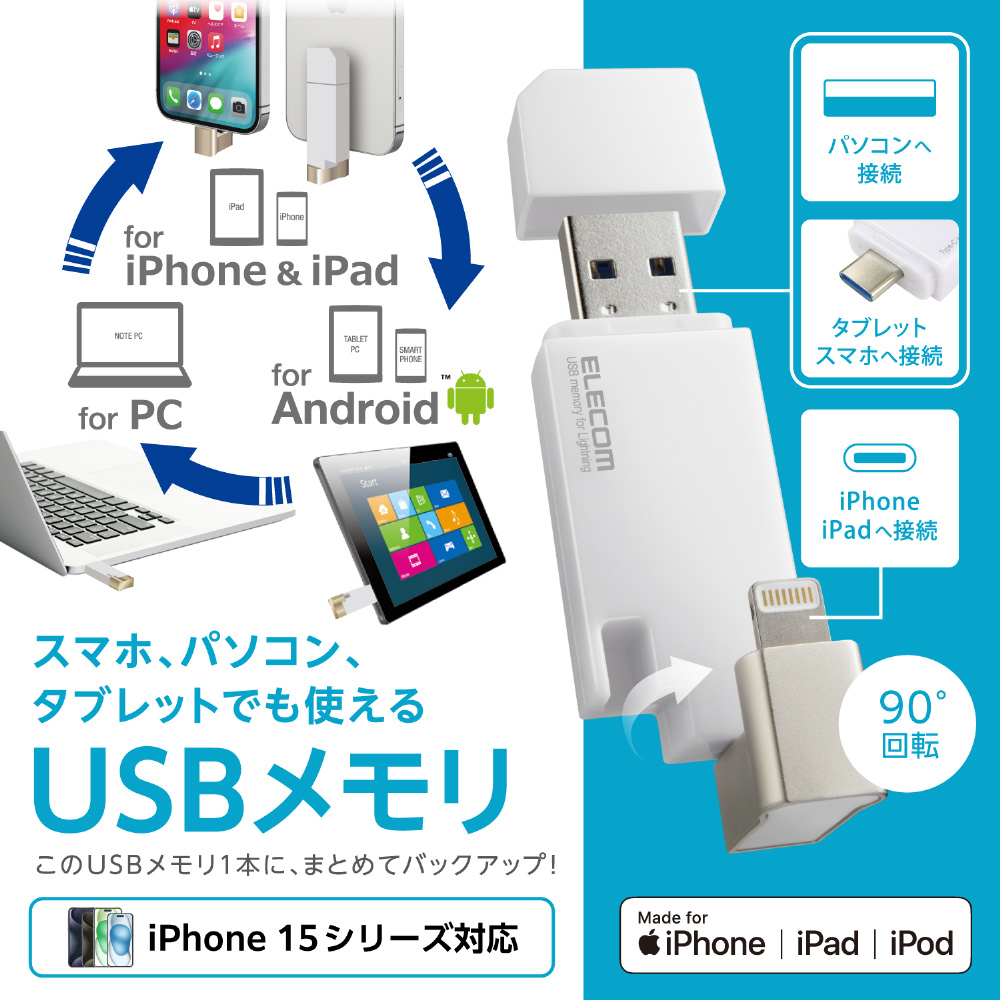 USBメモリ MFi認証(Android/iOS/Mac/Windows11対応) ホワイト MF-LGU3B064GWH [64GB /USB TypeA+USB TypeC+Lightning /USB3.2 /キャップ式]