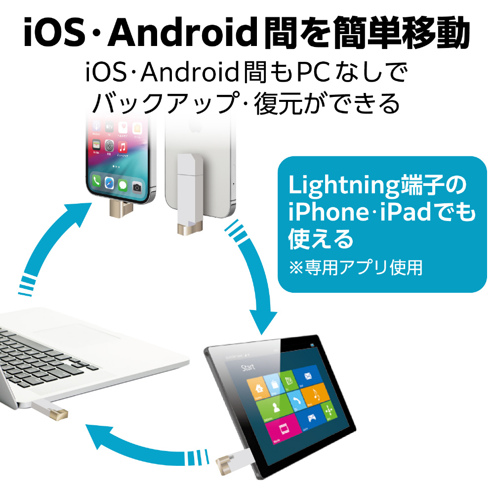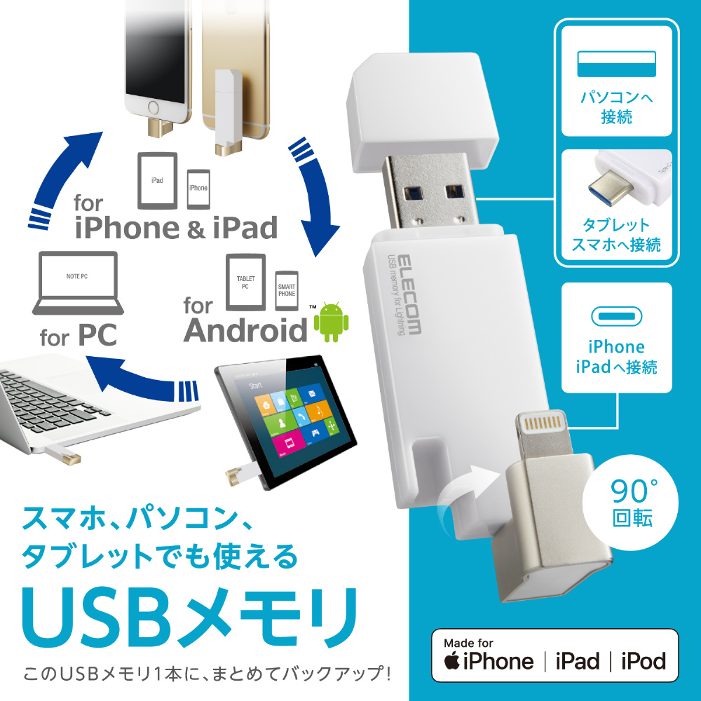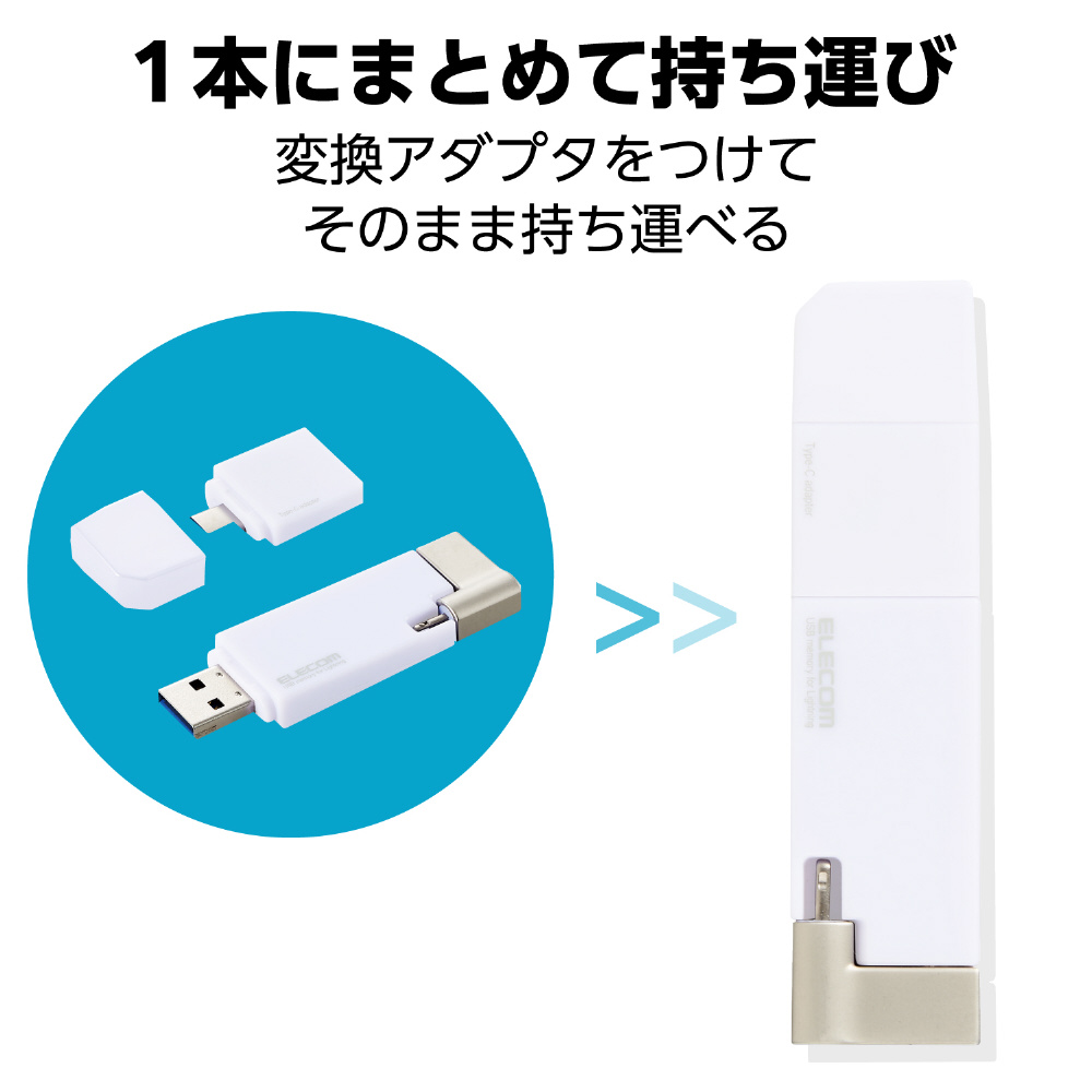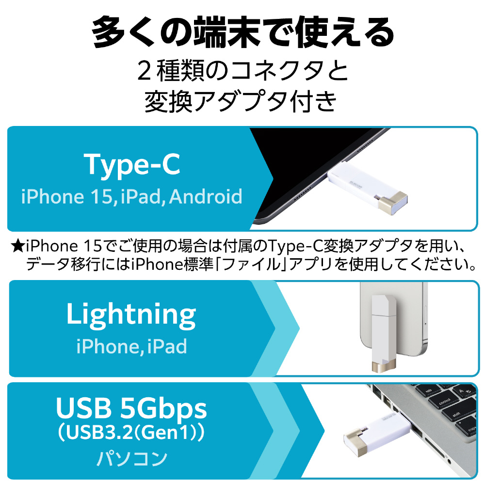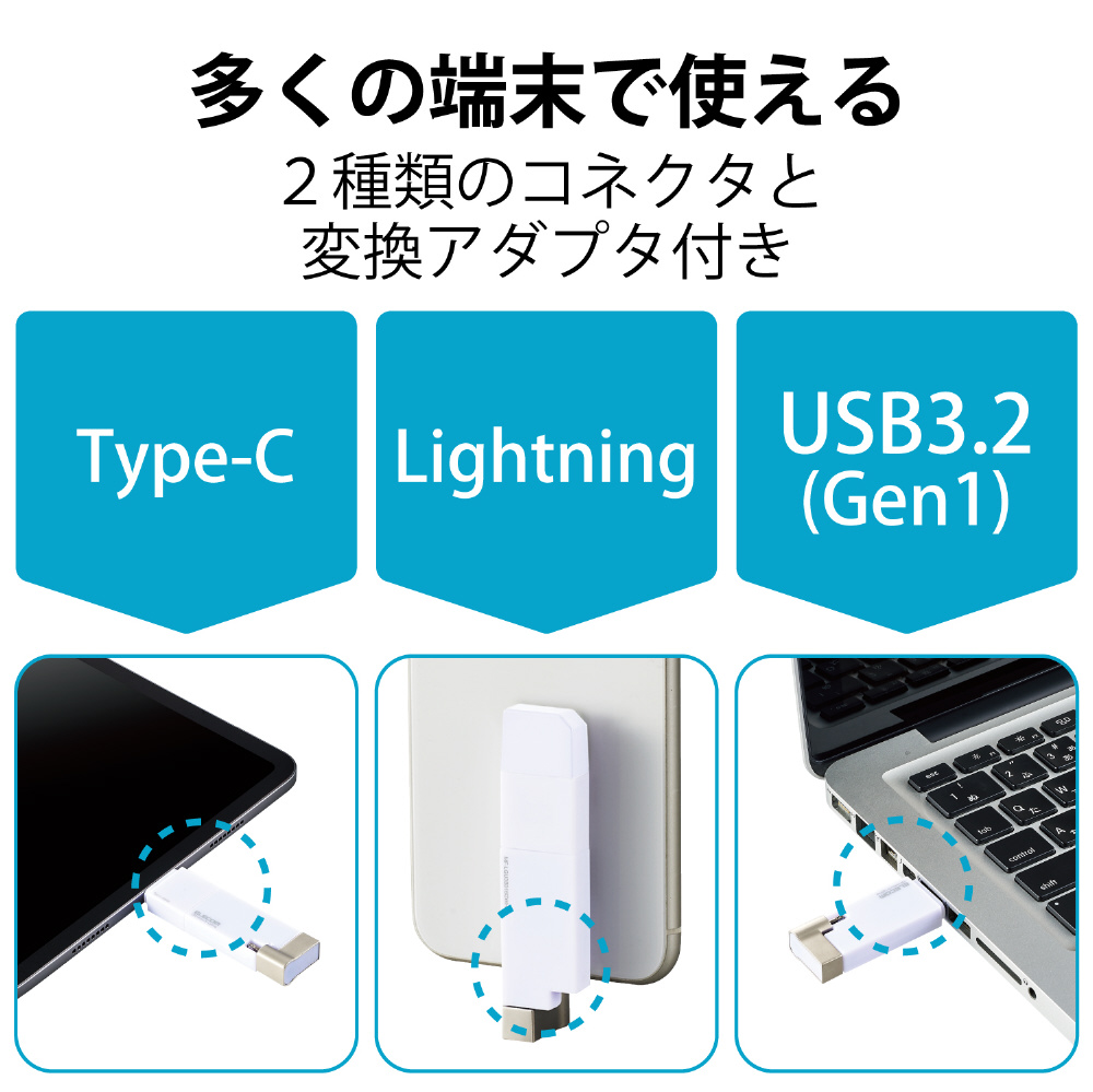パソコン・スマートフォン・タブレットをまとめてバックアップ!USB-AコネクタとLightningコネクタに加え、USB Type-C(TM)変換アダプタも付属した、様々な端末でマルチに使えるUSB3.2(Gen1)メモリ。