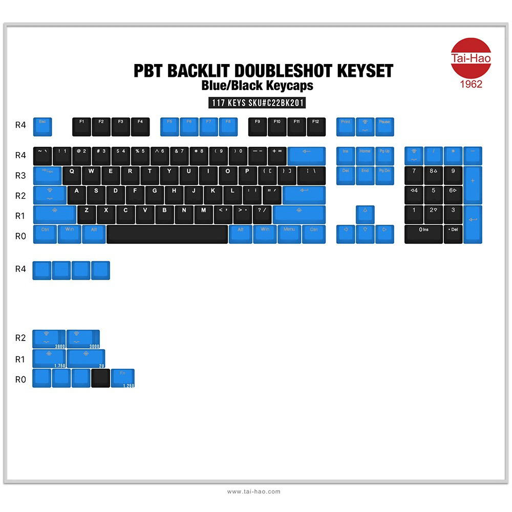 Tai-HaoのBlack / Blueキーキャップセットは、鮮やかなブルーが特徴のPBT製キーキャップセットです。