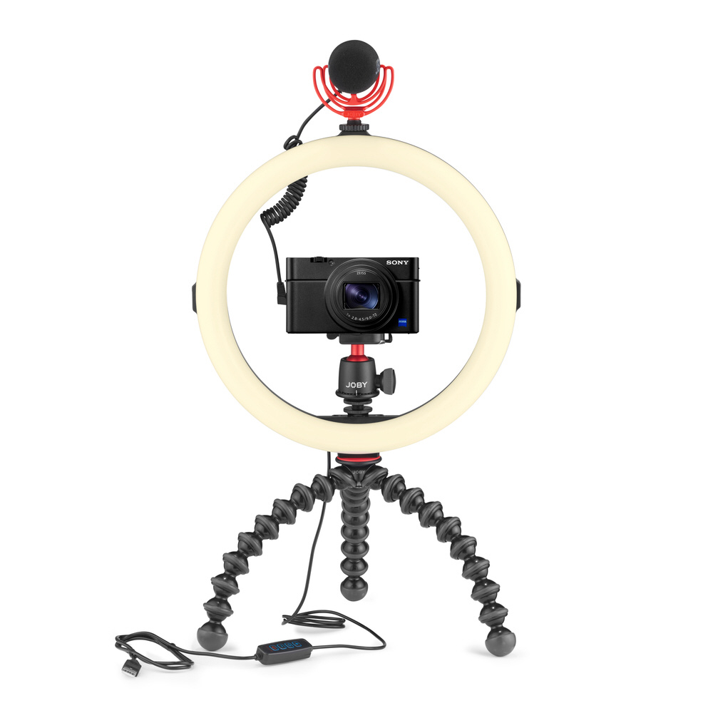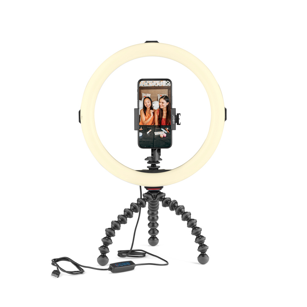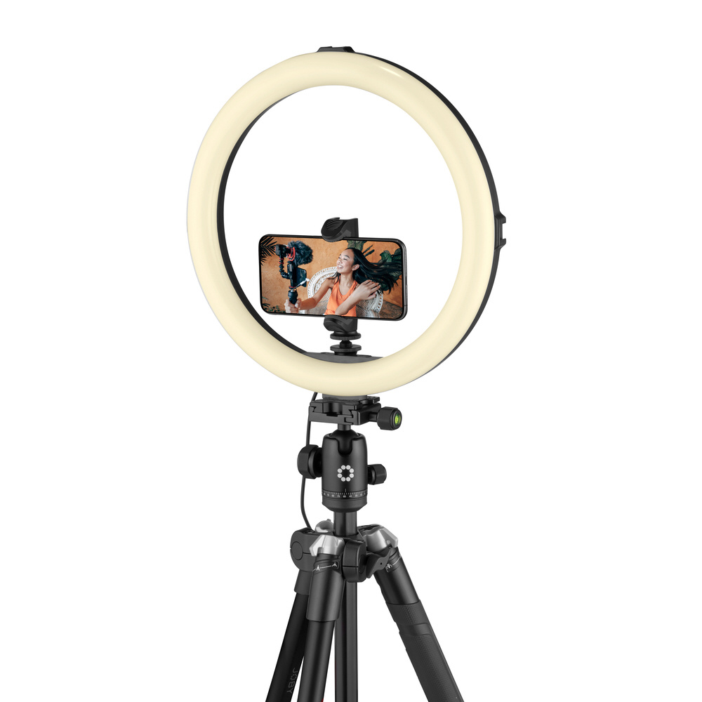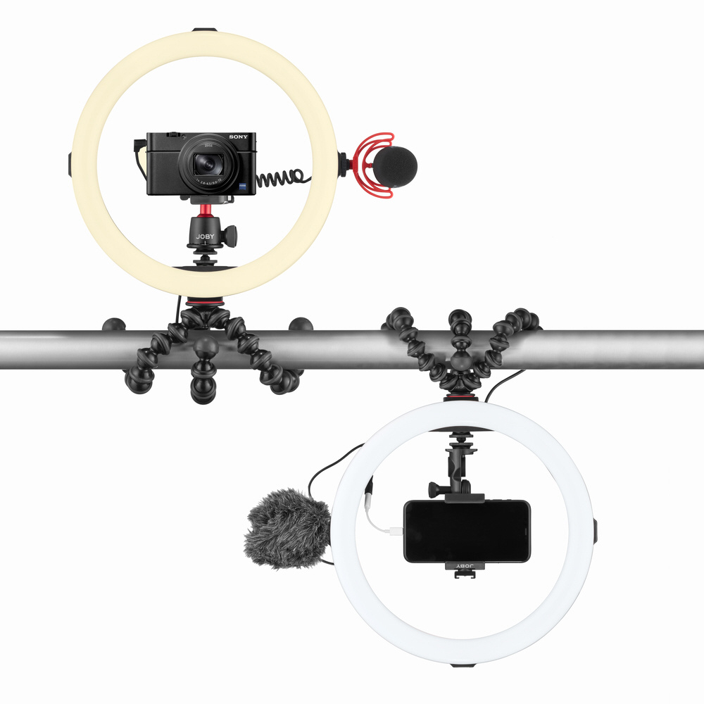 「●三脚用の1/4インチねじ穴とコールドシューマウントを備えたLEDライト。1/4インチオスねじを備えた三脚に固定でき、真ん中にスマートフォン(別途アダプター使用)やカメラ、外側にマイクの取付けが可能。」