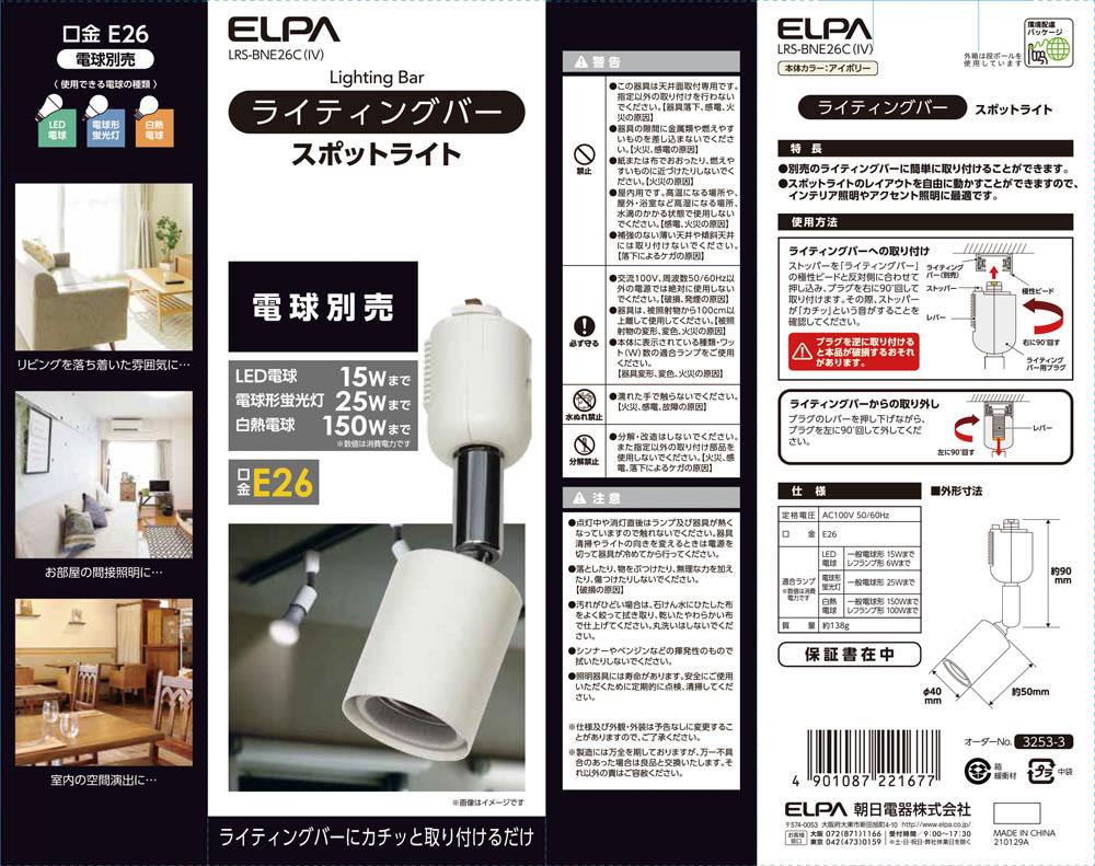| 商品名 | ライティングバー用 スポットライト アイボリー 電球別売 LRS-BNE26C(IV) [E26 /LED] |