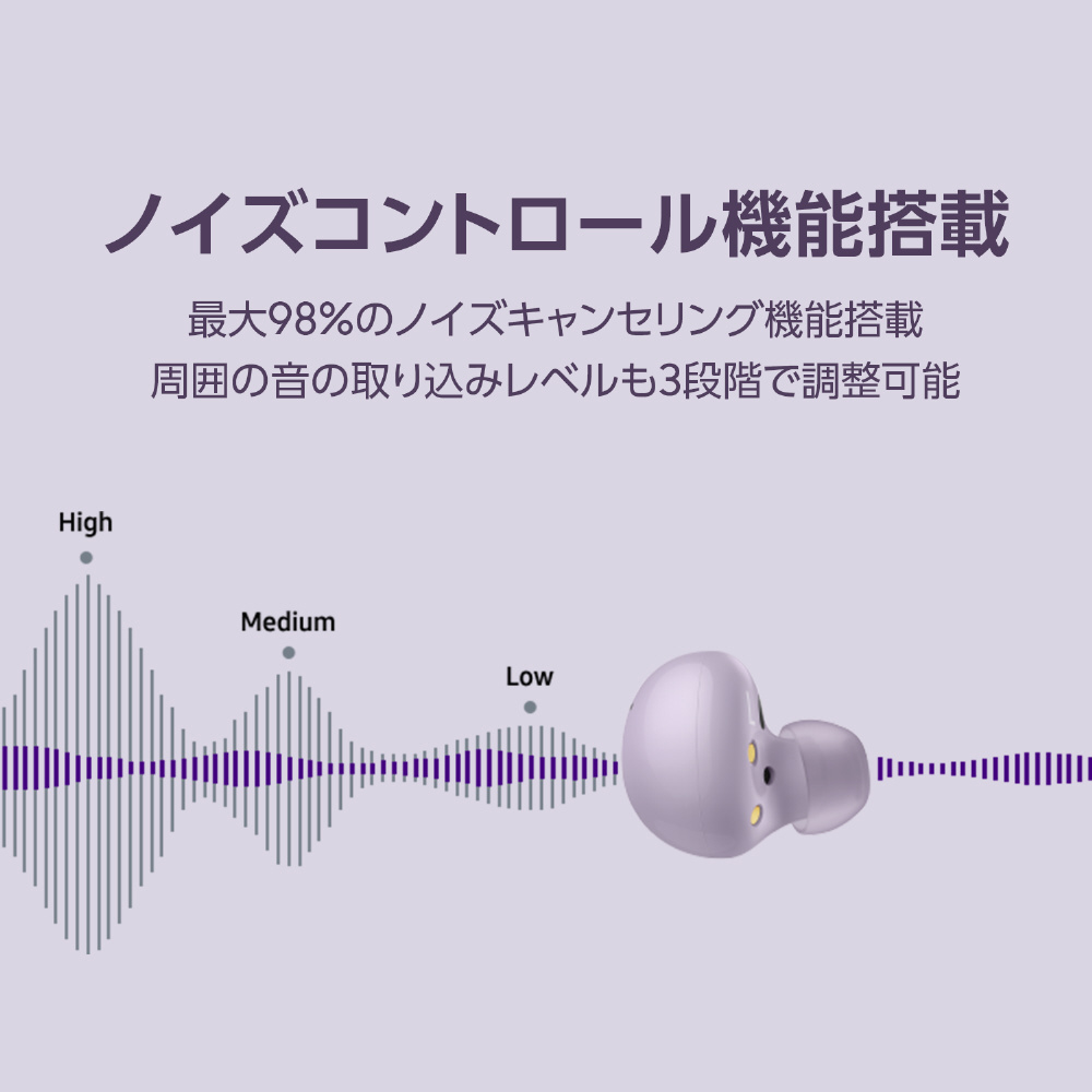 ANC(アクティブノイズキャンセリング)機能により、外部からのノイズを最大98%遮断します。また、3段階のアンビエント・サウンド・ボリューム・コントロールにより、イヤホンを装着した状態で周囲の音をどの程度聞こえるようにするかを選択できます。さらにANCと外音の制御機能は、同時発表されたスマートウォッチ「Galaxy Watch4」のアプリからも設定ができます。組み合わせて使うとより柔軟に切り替えが可能です。