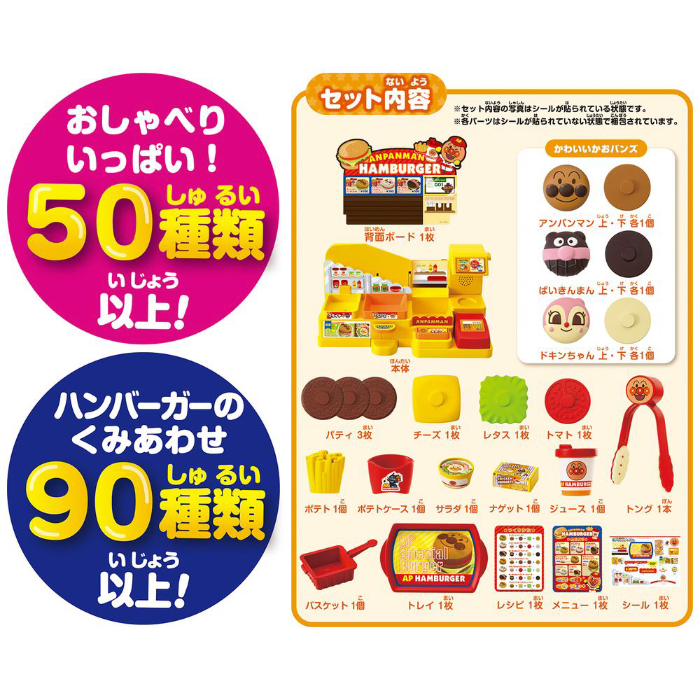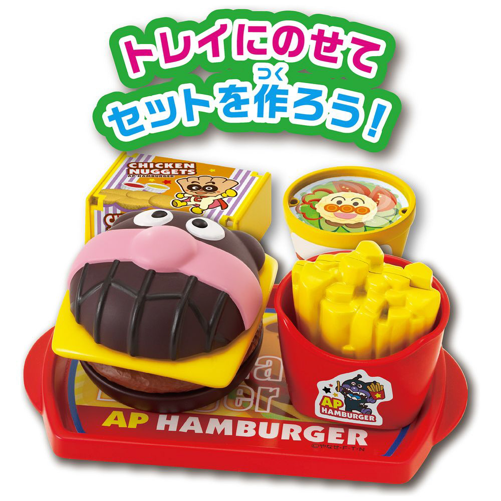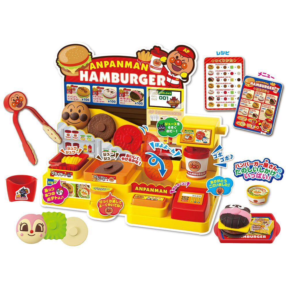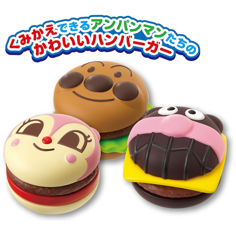 具材を自由に組み替えてアンパンマンのハンバーガーを作ろう!具材を焼いたり揚げたり本格的な遊びが楽しめます。