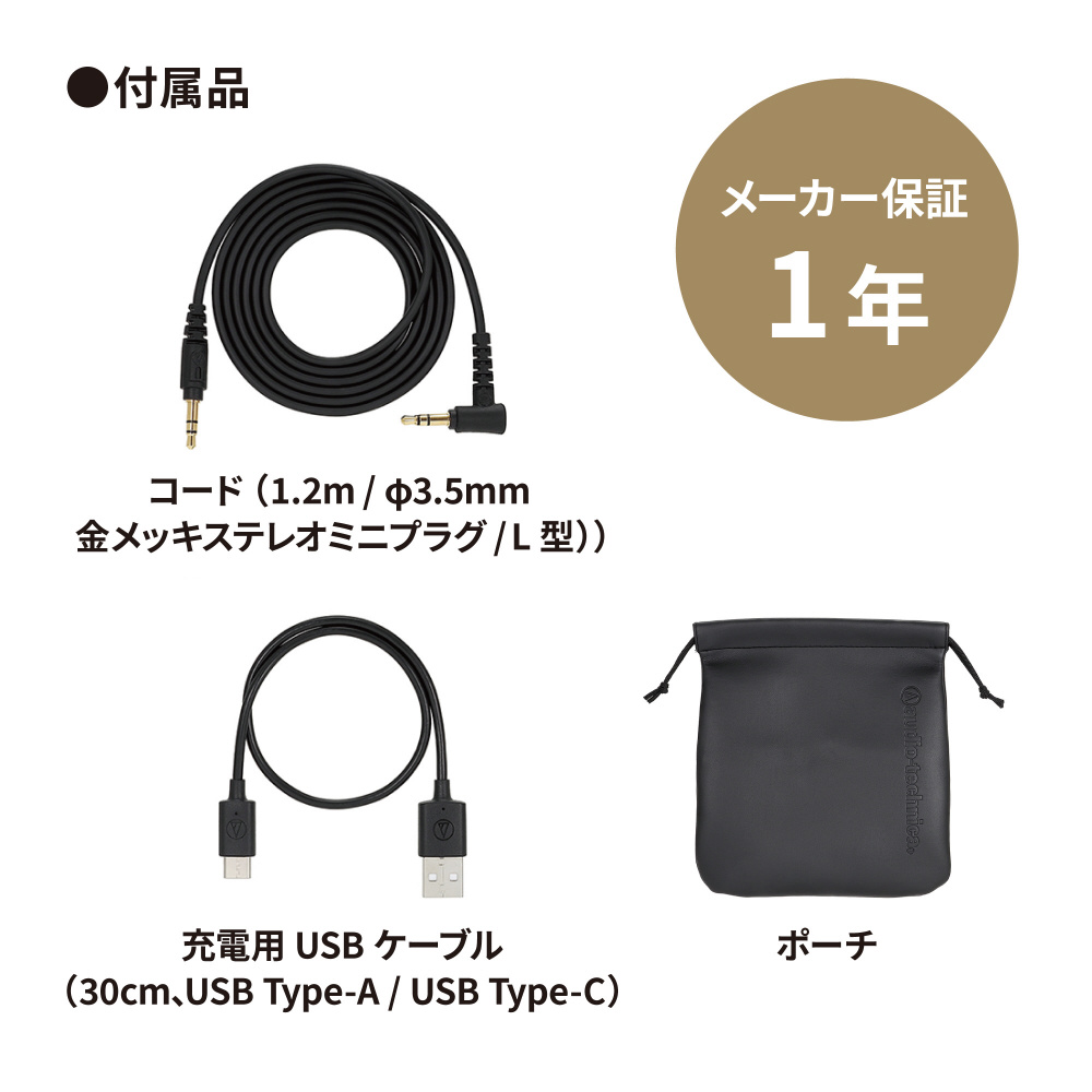 | 付属品 | 充電用USBケーブル(30cm、USB Type-A / USB Type-C)、コード:(1.2m/φ3.5mm金メッキステレオミニプラグ/L型)、ポーチ |