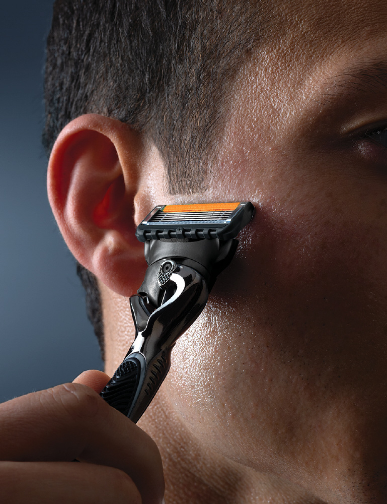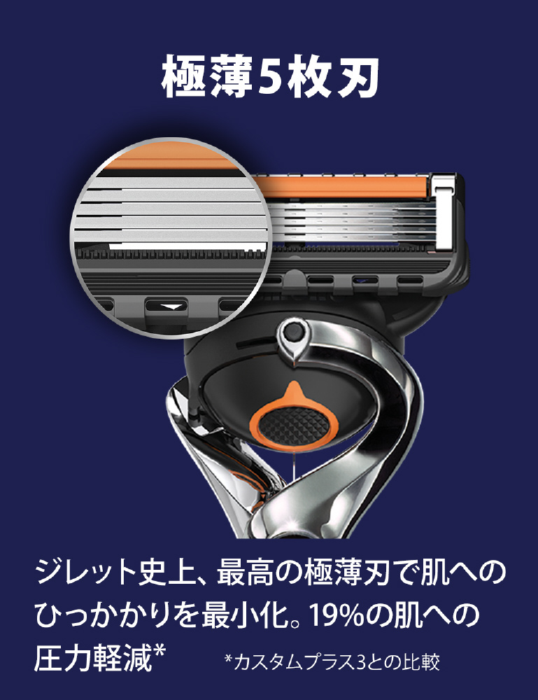 マイクロコーム付極薄5枚刃 ジレット史上、最高の極薄刃で肌へのひっかかりを最小化。19%の肌への圧力軽減**。
