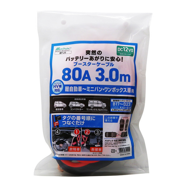 | 商品名 | ブースターケーブル HV車対応〜普通自動車用 DC12V・80A 3m BT-21 |