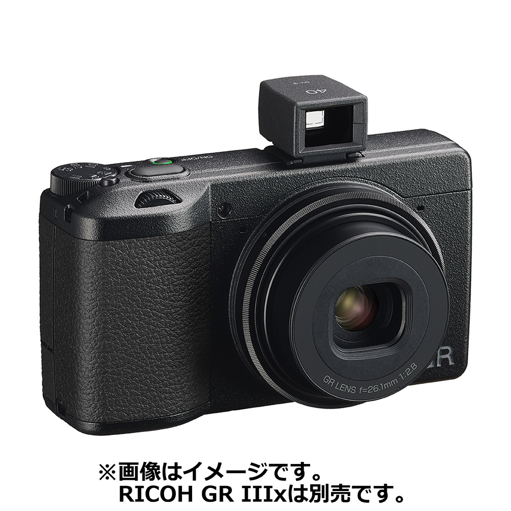 RICOH GR IIIx 専用の外付け光学ファインダー。40mm相当(35ミリ判換算)用のフレーム(縦横比1:1撮影用マーク入り)付き。ケース付属。