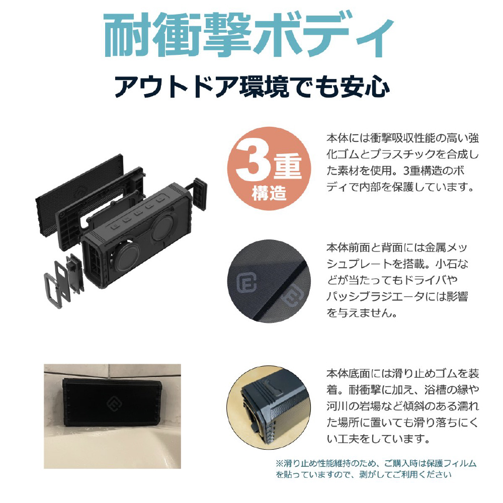 国際標準防水規格の上位規格「IPX7」に対応。完全防水仕様となっています。海や川辺のアウトドアやスキーやスノボ等のレジャー、屋外イベント等での天気の急変による降雨への備えとしても万全です。本体は強化プラスチックと強化ゴムの合成素材、前面メッシュ部は金属素材で、いずれも耐衝撃性を備えています。また、カラビナ(フック)付ですので、移動中のバックパックやキャンプ地でのテントや樹木の枝など、場所を選ばず設置して頂けます。耐衝撃ボディと357gという軽さで、どこにでも持ち運び可能です。もちろん、屋内の水回りやお風呂などの水回りでも心配なくお使いいただけます。