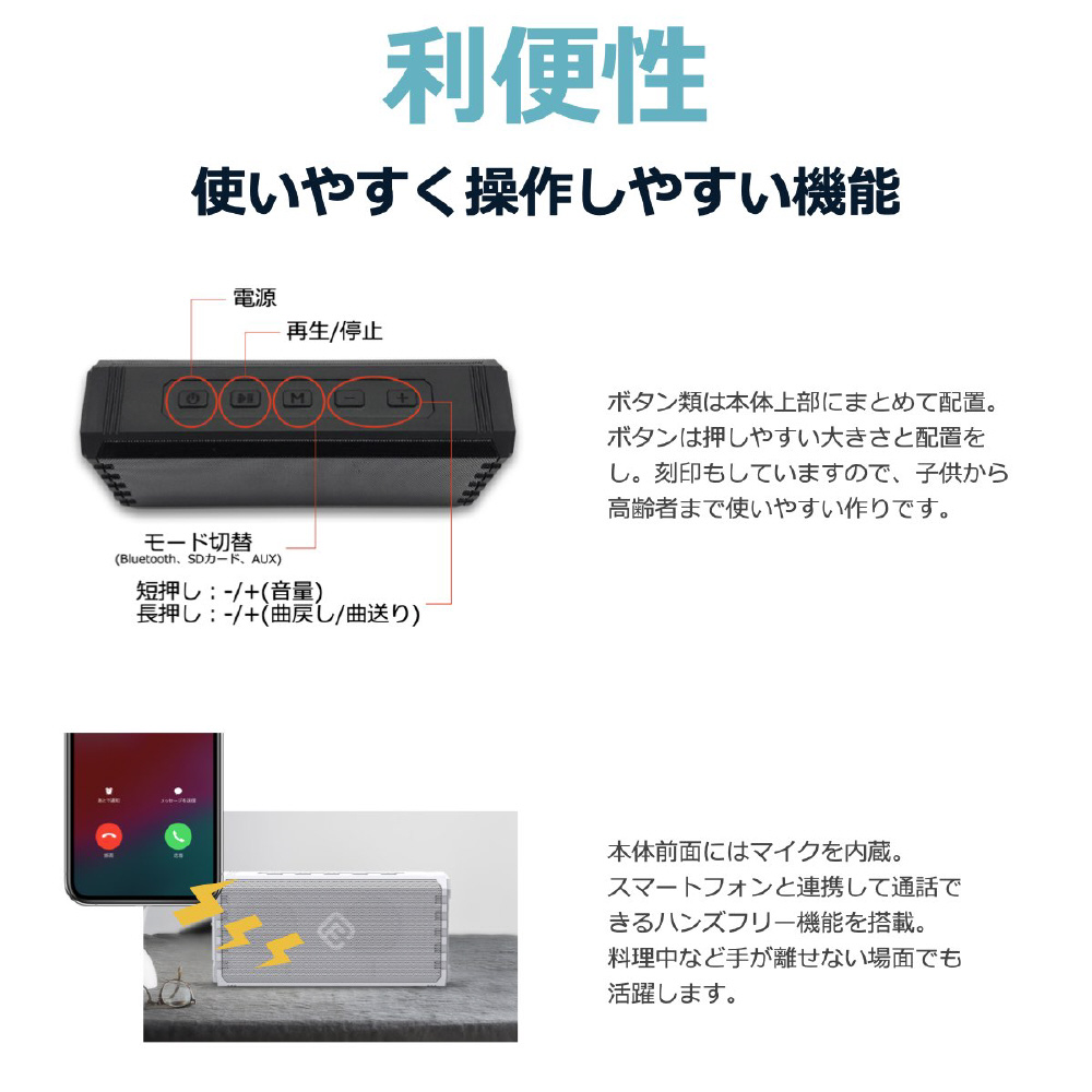 本体前面にマイク付き(マイク内蔵)で、スマートフォンの電話機能と連動してハンズフリー通話が可能です。PCやMacと接続すると、手元でスピーカー兼マイクとして利用可能。内蔵のスピーカーやマイクより扱いやすく、在宅勤務やオンラインミーティングでも活躍します。本体にマイクロSDカード(TFカード)のスロットやAUX端子を搭載しており、Bluetooth以外の入力による音楽再生も可能。ランダム再生とリピート再生も可能ですので、店舗等での継続再生目的としてもお使い頂けます。
