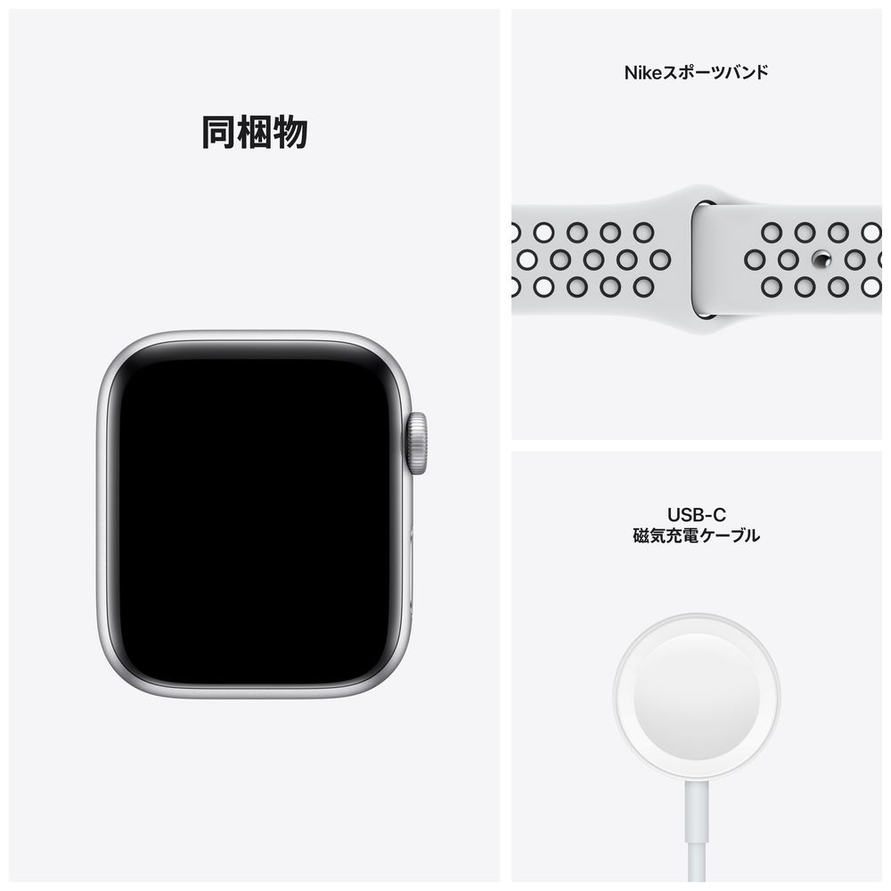 Apple Watch Nike SE(GPSモデル)第1世代 44mmシルバーアルミニウムケースとピュアプラチナム/ブラックNikeスポーツバンド シルバーアルミニウム MKQ73J/A 【磁気充電-USB-Cケーブル同梱モデル】