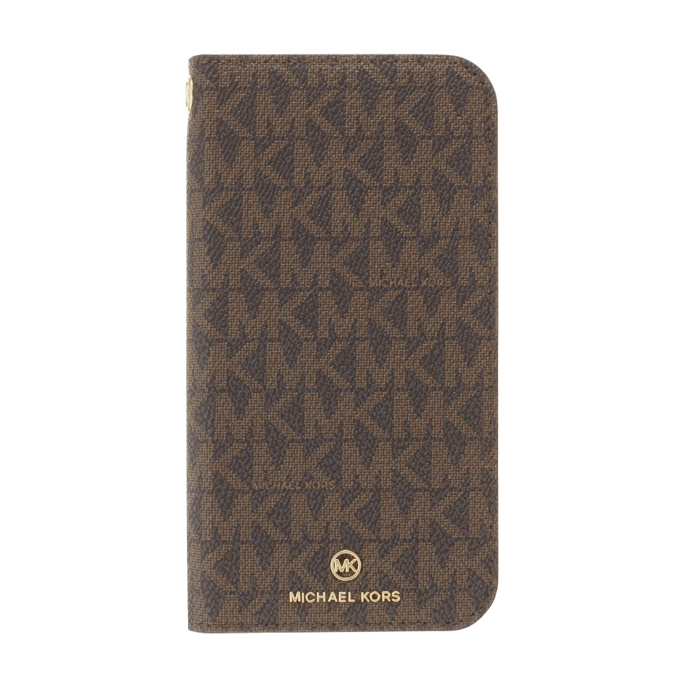 ブラウンカラーのMKシグネチャーのロゴプリントキャンバスで施されたケースのエッジをAWカラーでコーティングしたデザインの背面タイプのスマホケース。MagSafe対応。