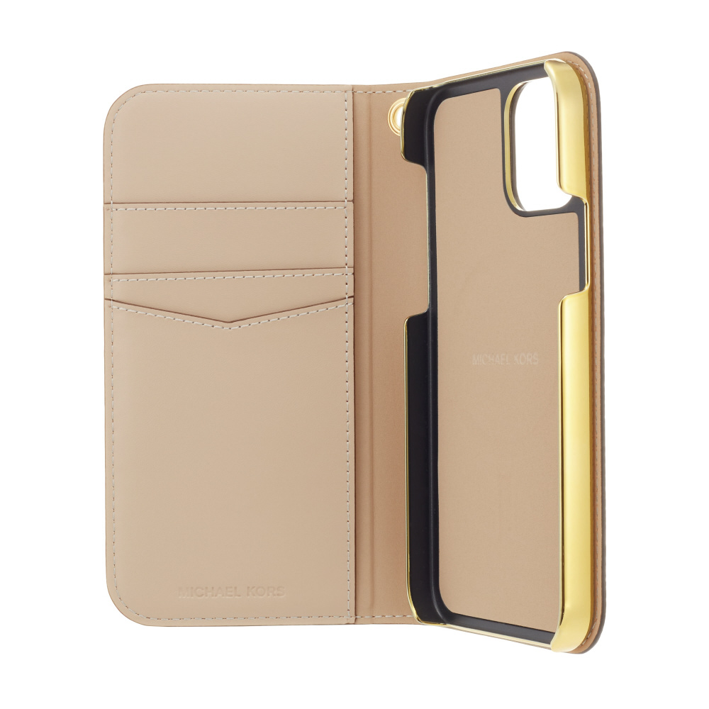 MKシグネチャーのロゴキャンバスと無地のAWカラーレザーを組み合わせたシックな印象のブックタイプのスマホケースです。