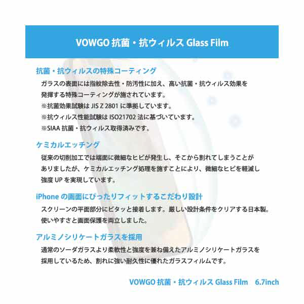 商品名 iPhone 13 Pro Max対応 6.7inch VOWGO 抗菌・抗ウィルス ガラスフィルム