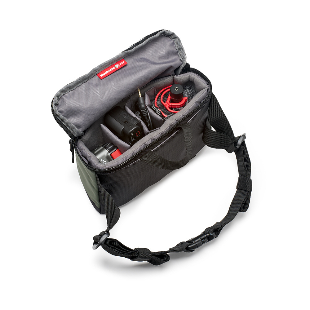 「●ミラーレスカメラと交換レンズを収納可能。大きな開口部のメインコンパートメントは、上部から機材の出し入れがしやすいデザインになっています。内部の仕切はカスタマイズが可能で、コンパクトカメラやオンカメラマイク、LEDライト、携帯電話、財布、鍵などを整然と収納することができます。ミラーレスカメラなら、標準レンズを装着したまま、交換レンズも一緒に収納できます。インナーケースを取り外せば、普段使いのバッグとして活躍します。」