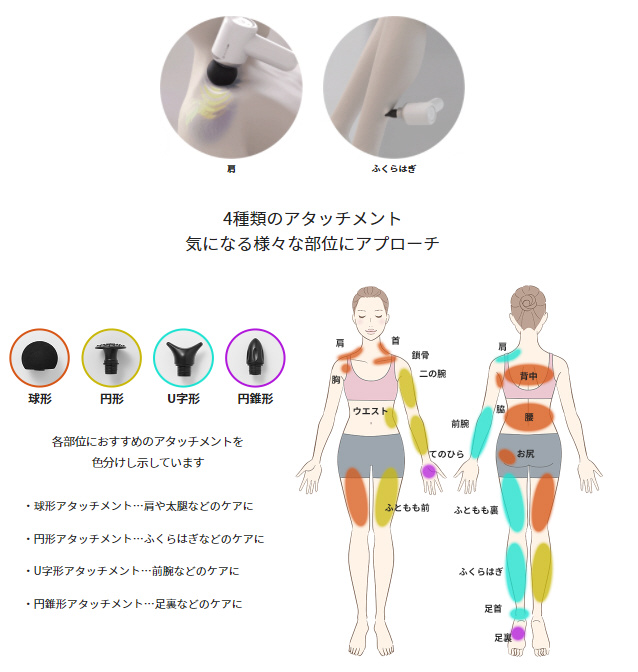 お好きな部位にアプローチして、日々の疲れや、運動時のウォーミングアップ、リリース、筋肉のケアに大活躍します。