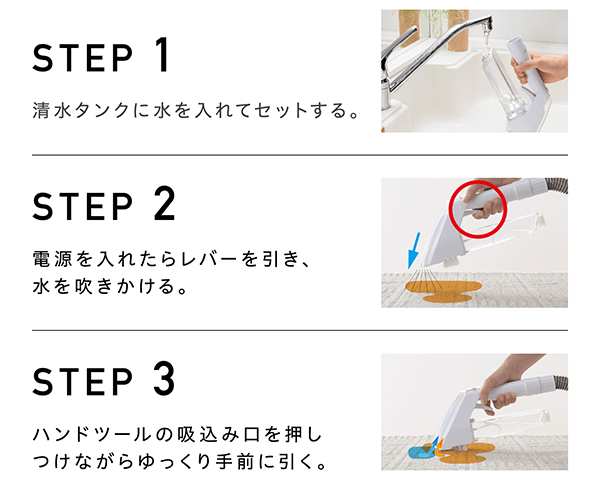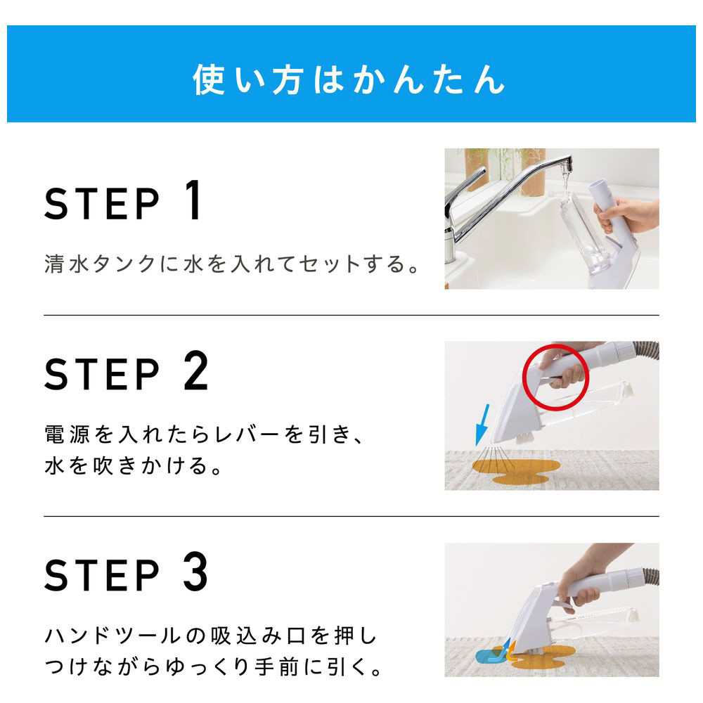 スプレーで水を吹きかけ汚れを浮かせ、浮かせた汚れを水と共に回収できるリンサークリーナーです。