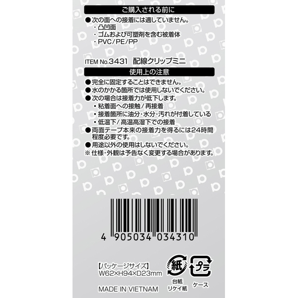 | 商品名 | 3431 配線クリップミニ 12.0×10.0mm/15個入り 黒色 3431 |