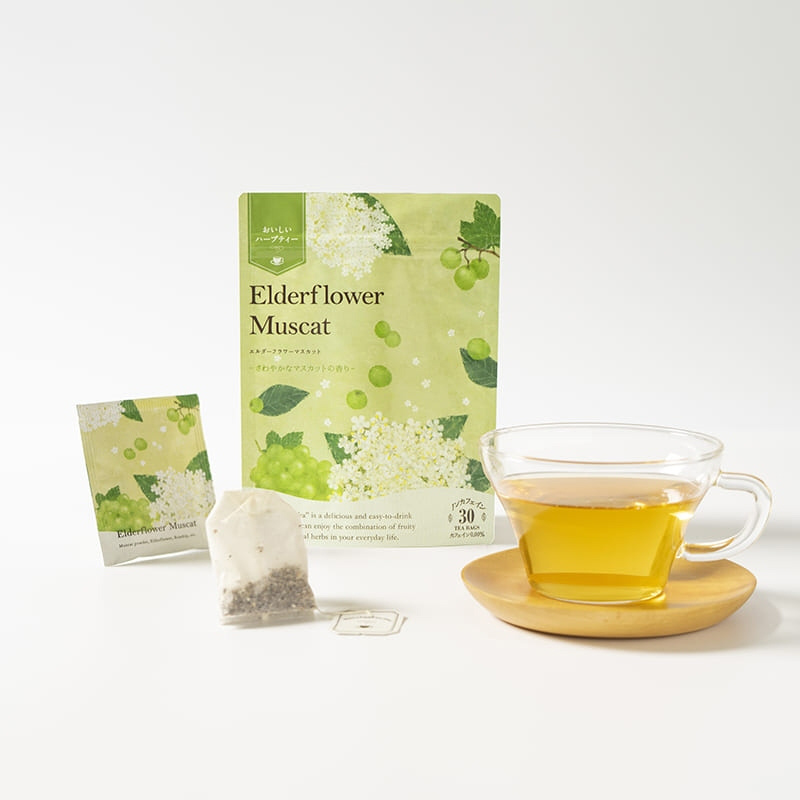 エルダーフラワーの優しい味わいと、マスカットの爽やかな香りで気分転換をしたい時におすすめです。ノンカフェイン(カフェイン0.00%)
