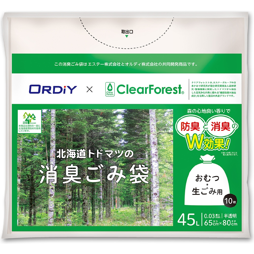 エステーの森の力で生活空間の空気を浄化する『クリアフォレスト』を配合したごみ袋です。