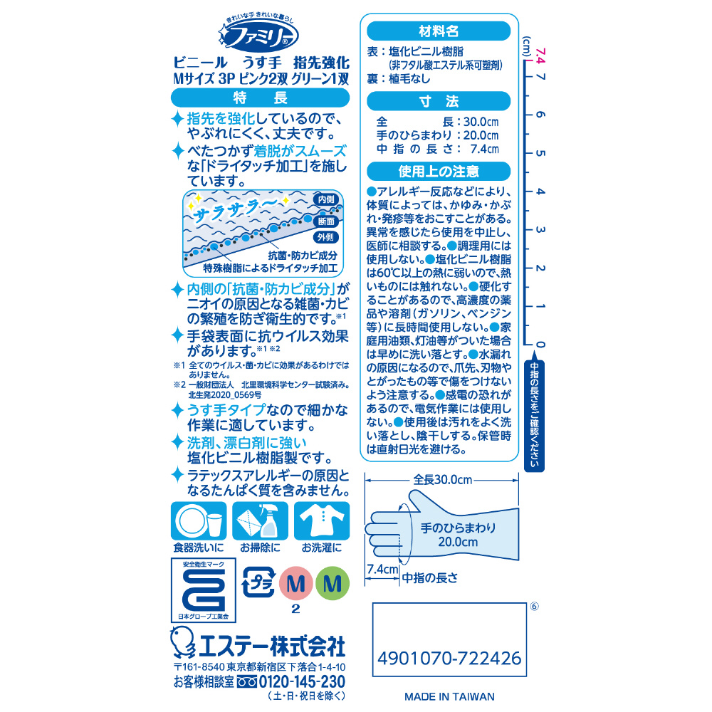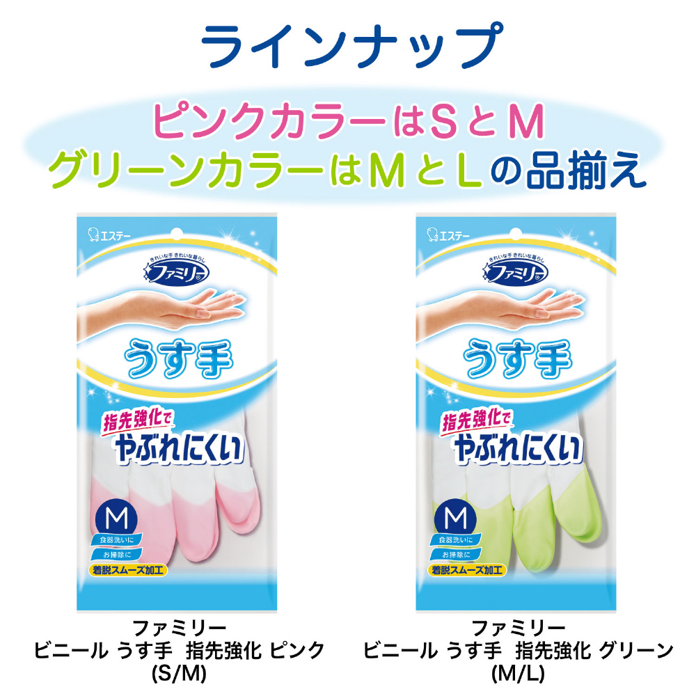 ファミリー ビニールうす手 指先強化 Mサイズ 3双パック(ピンク2双・グリーン1双) [家庭用手袋 指先強化でやぶれにくい ビニール手袋] ピンク/グリーン ST72242