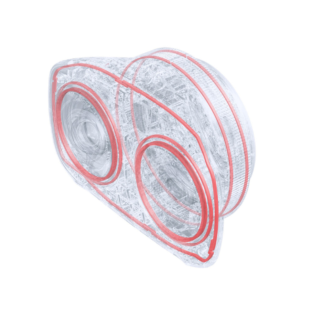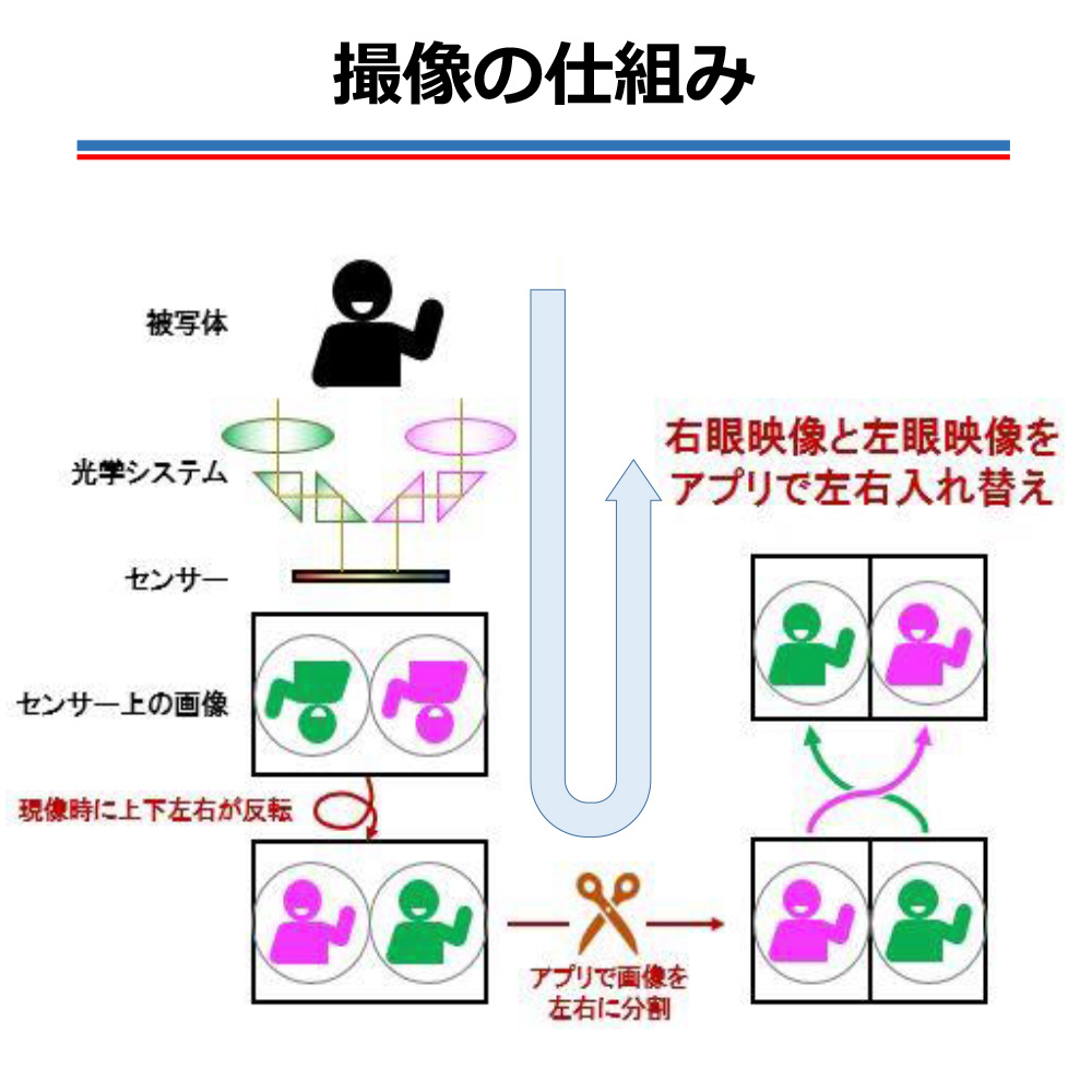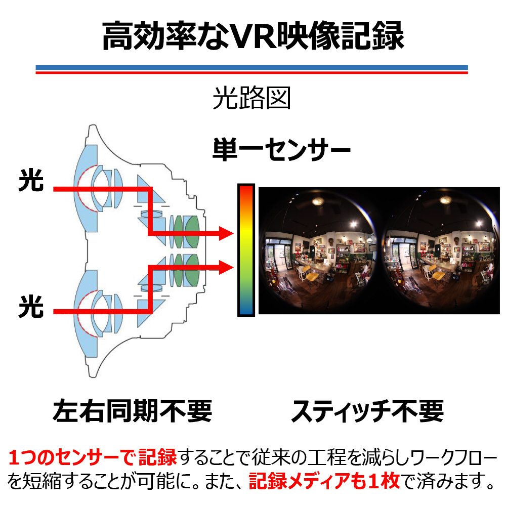 ・2眼レンズそれぞれから入射する光を単一のCMOSセンサーを通じて記録することが可能。撮影前のカメラ位置の調整や同期設定、撮影後に映像を繋ぎ合わせる編集(スティッチ作業)が不要となり、映像制作ワークフローを効率化。