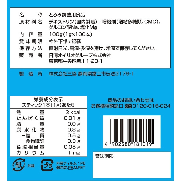 【原材料】デキストリン、増粘剤(増粘多糖類、CMC)、グルコン酸Na、塩化Mg