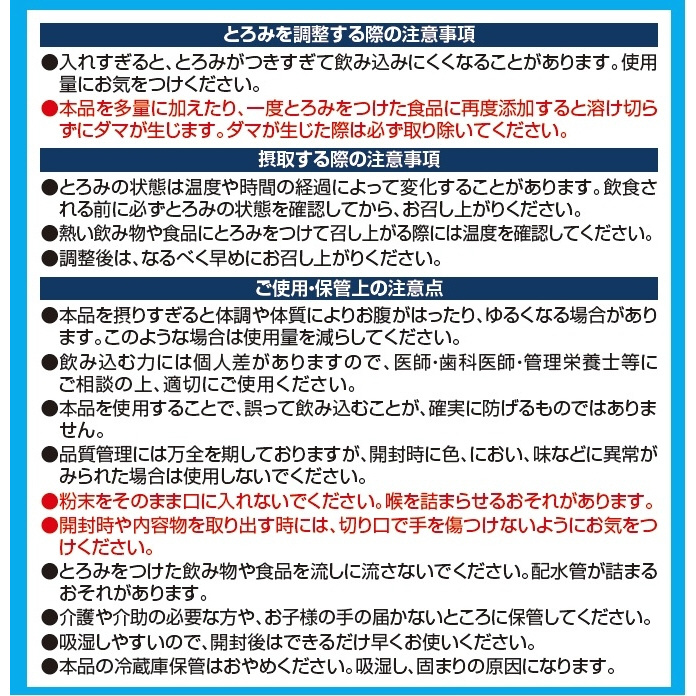 ●本品を多量に加えたり、一度トロミをつけた食品に再度添加した場合で、ダマが生じた際は必ず取り除いてください。