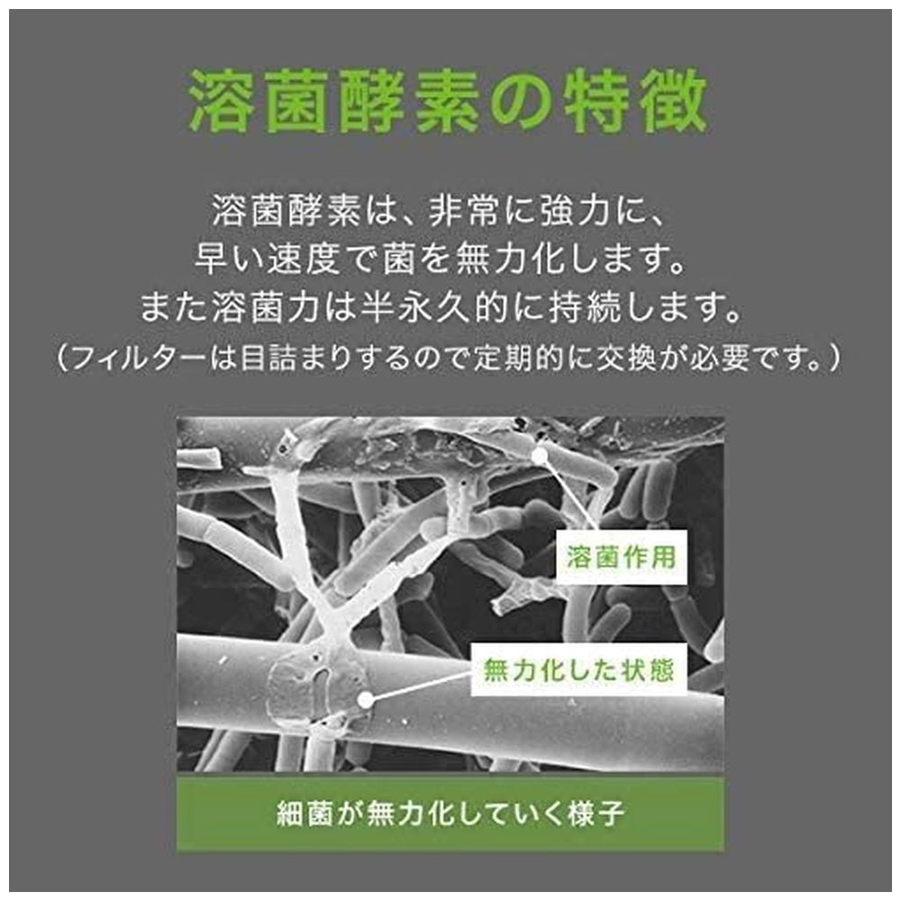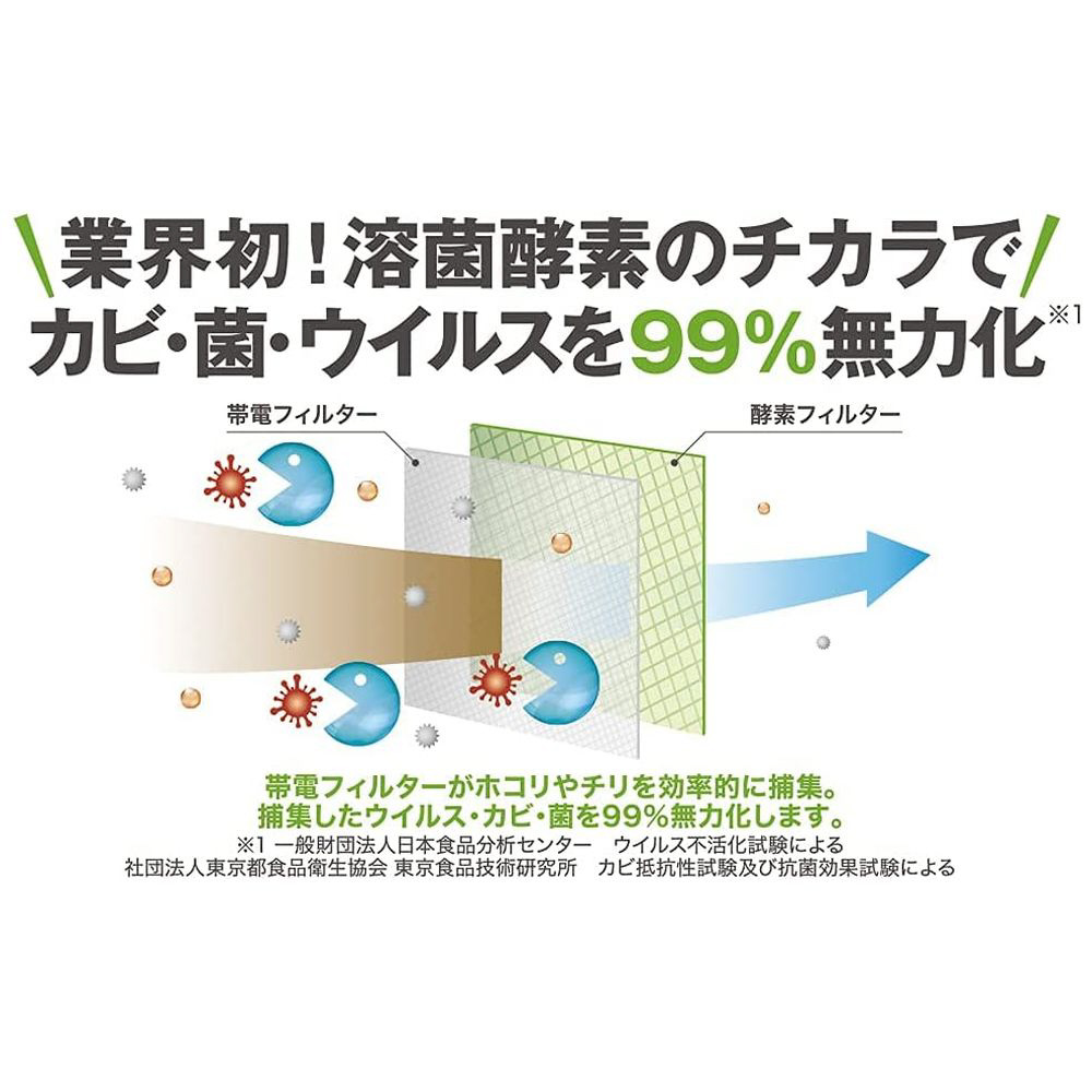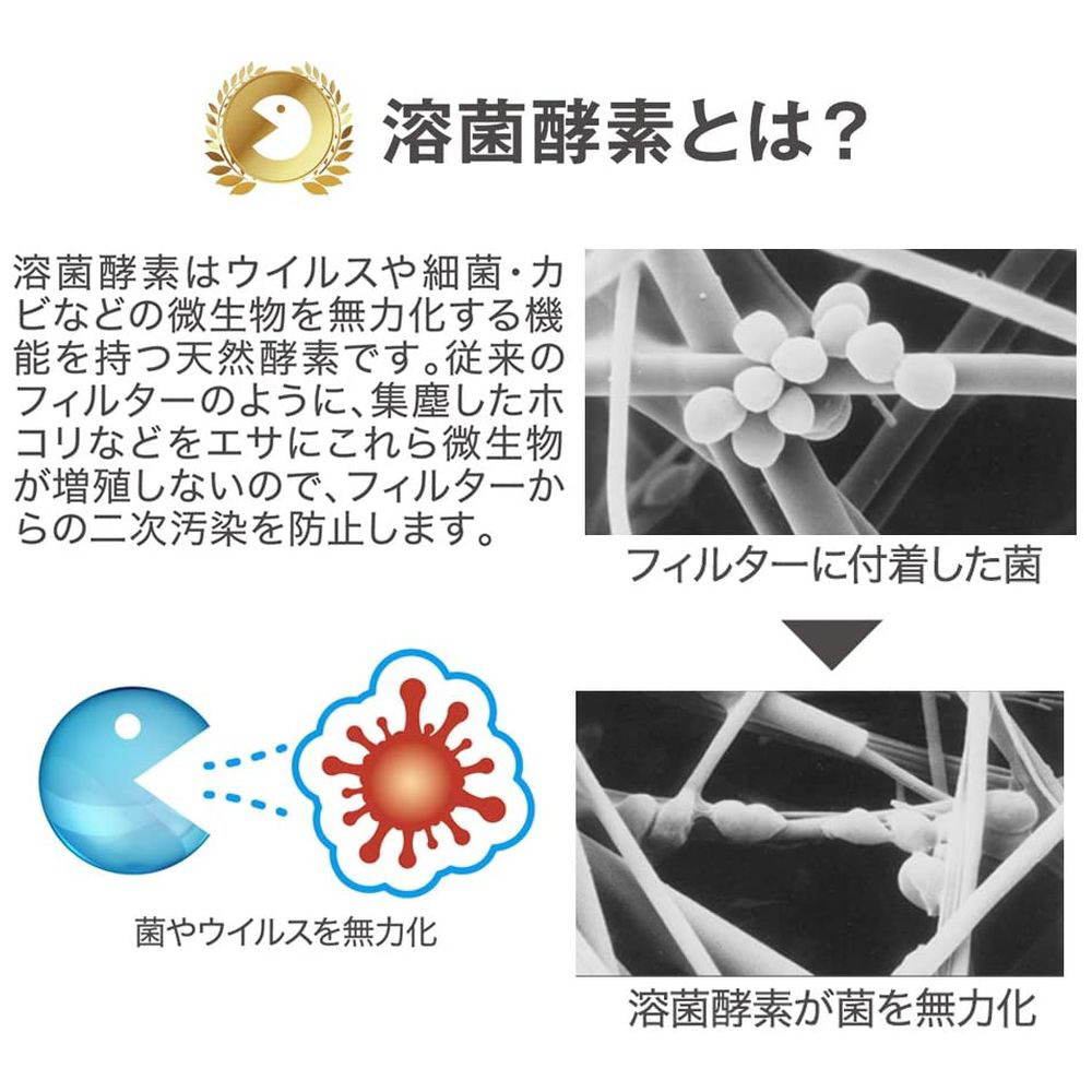 ■溶菌酵素配合フィルターが捕集したウィルスやカビ・細菌などの微生物を99%無力化し増殖を防ぎます。