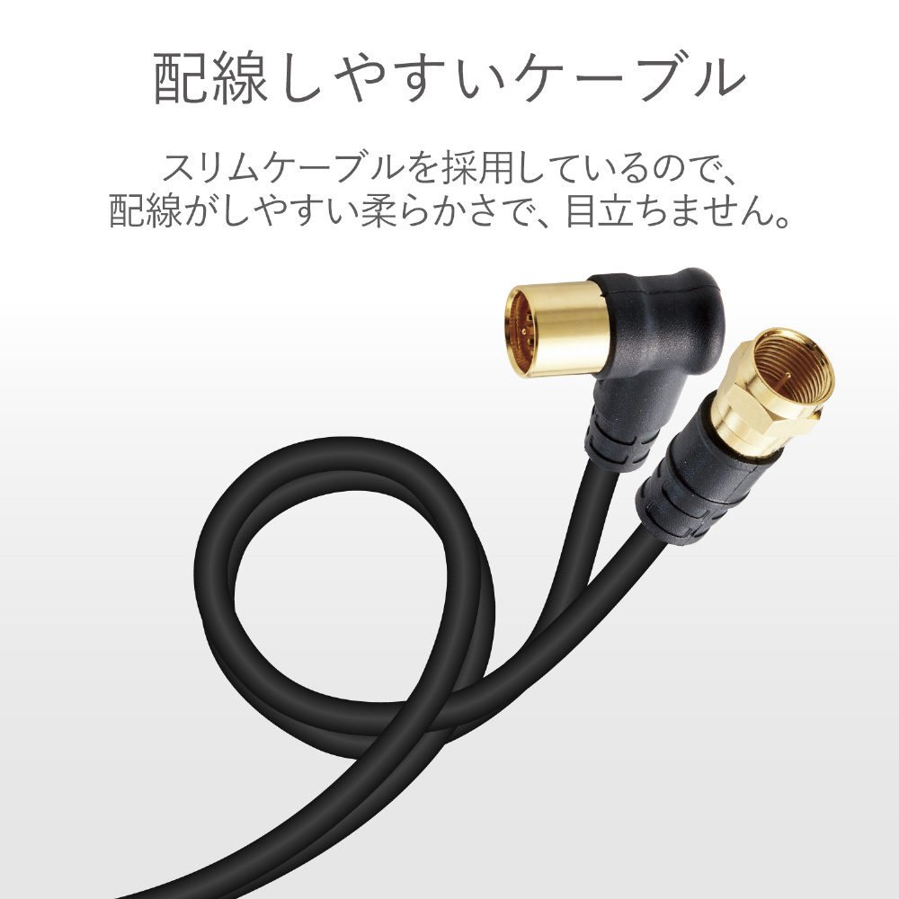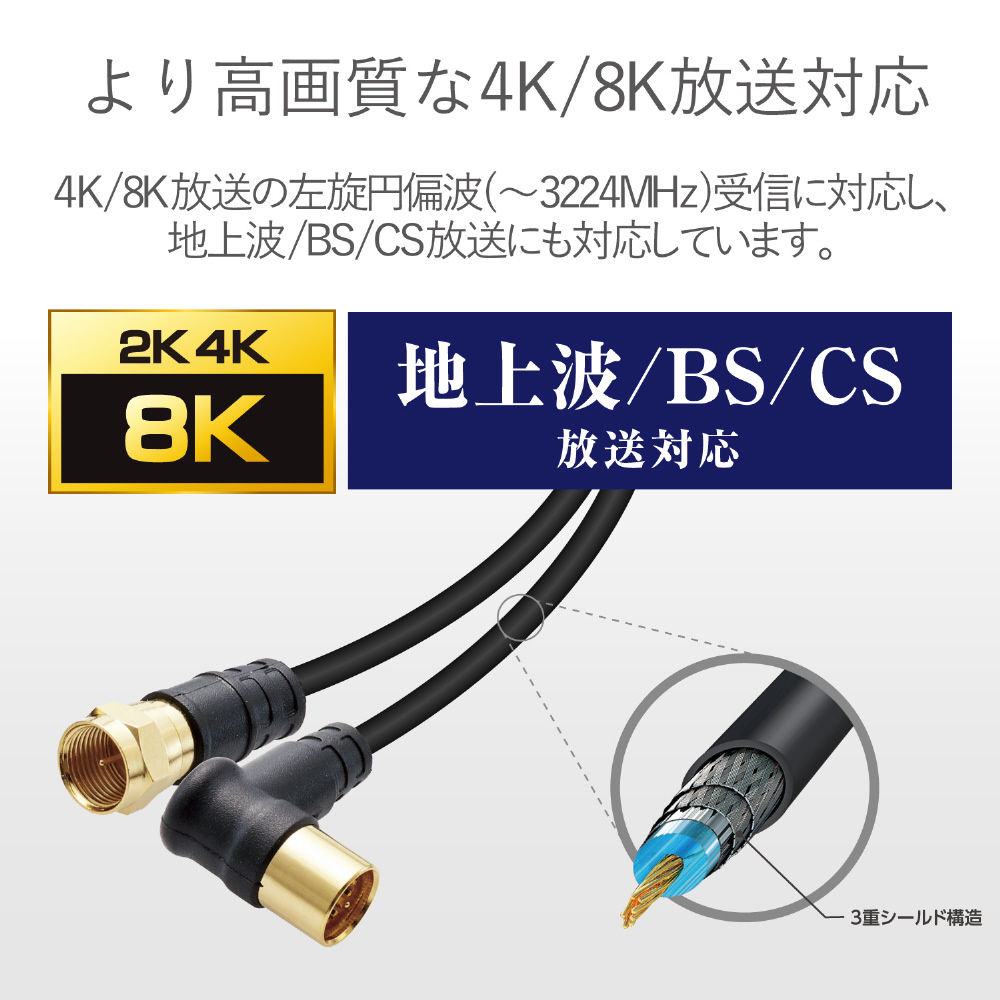 新4K・8K(3224MHz)放送に対応した製品です。地デジ・BS・CSのデジタル放送やケーブルテレビでも使用できます。壁面のテレビ端子とテレビ、レコーダー、テレビチューナー付パソコンなどの接続に最適な接続ケーブルです(2m)。