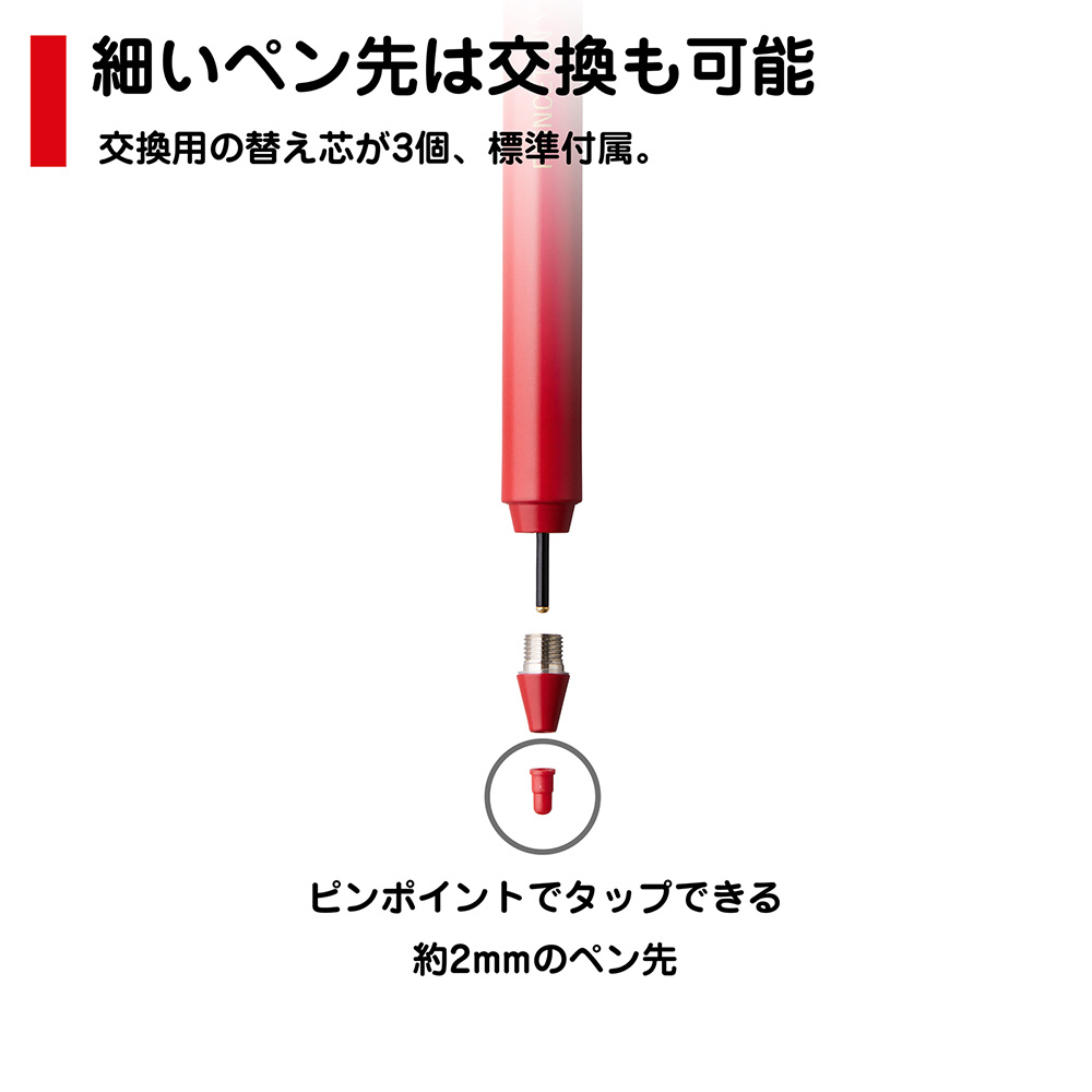 | 仕様2 | [外形寸法]直径約9 (先端部2.) × (H)142mm [質量]11g [ペン先素材]シリコン [電源]内蔵リチウムイオン充電池 [充電時間]約9分 [連続動作時間]約15時間 [オートオフ]約5分 [汎用モード]パームリジェクション:× [iPad モード]パームリジェクション:〇 [同梱品]本体、替え芯× 3 本、充電用USB ケーブル(A-C)約3cm、ユーザーズガイド/保証書 |