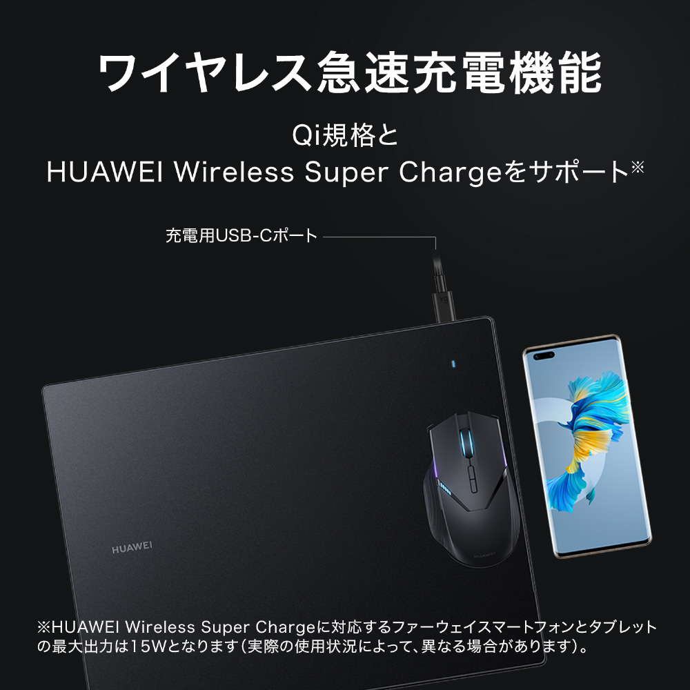 HUAWEI Wireless Charging Mouse Pad GTは、非常になめらかなポリマー素材を使用しており、マウスを楽に動かすことができます。