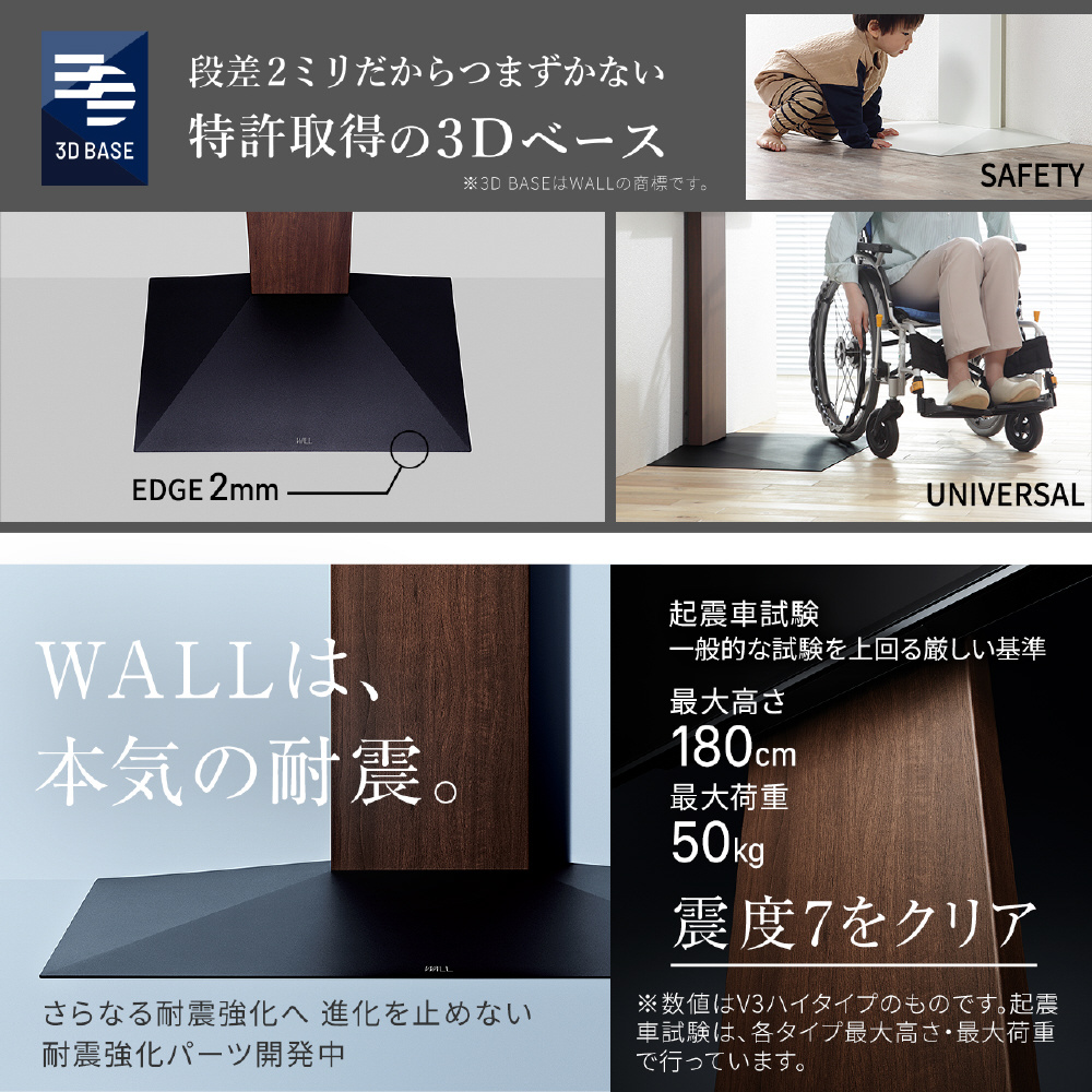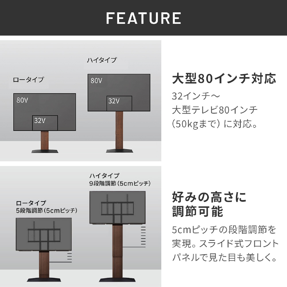 「テレビを壁にする」大型テレビを設置してもお部屋を広く、美しくつかえるWALLテレビスタンド。最大80V型の大型テレビに対応し高さ調節、背面収納などの機能面とフラットで薄型なデザイン性を両立させた壁寄せタイプのテレビスタンドです。